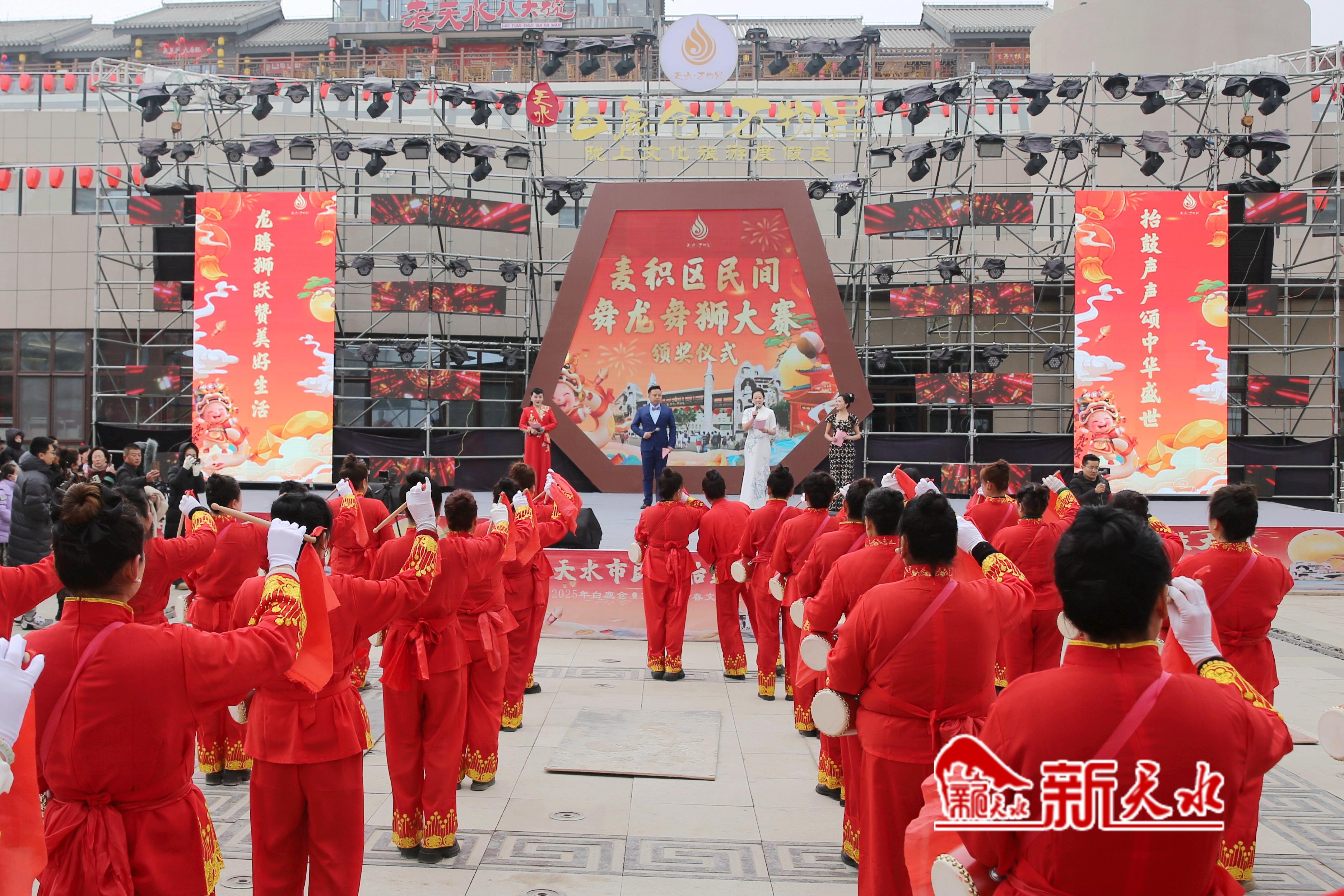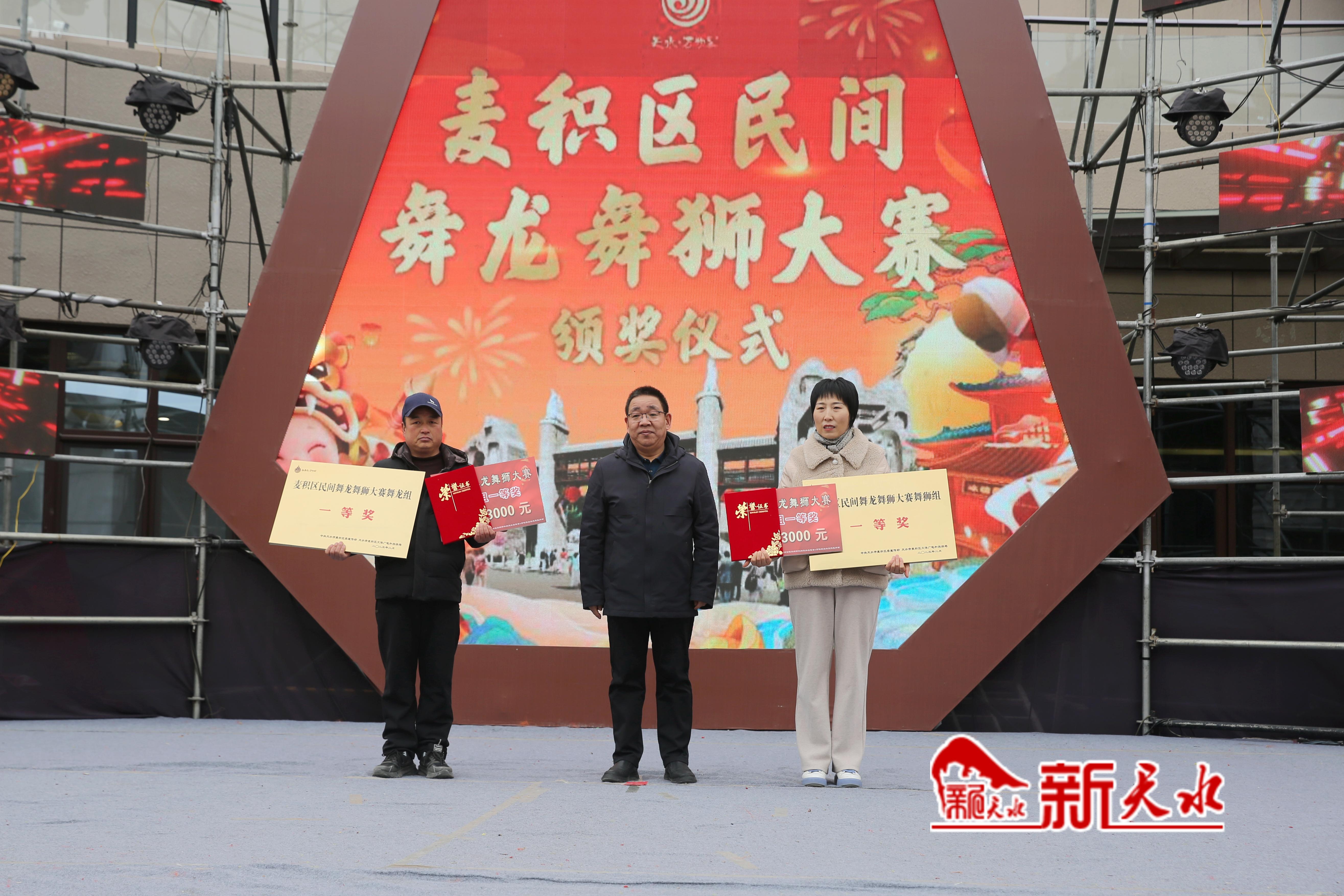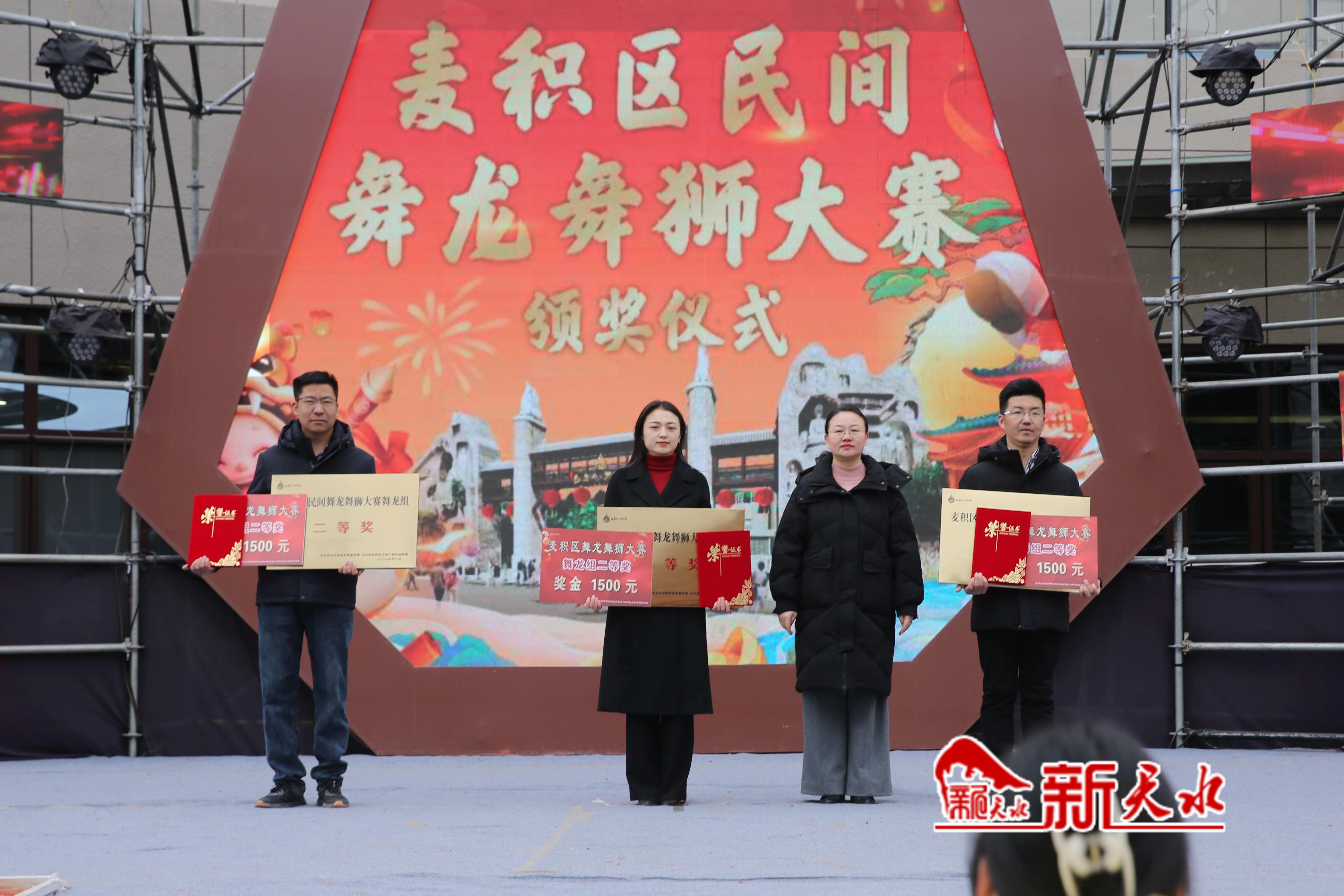 新天水讯【记者王琴】2月12日,“金蛇狂舞耀麦积·白鹿仓里过大年”麦积区民间舞龙舞狮大赛颁奖仪式在天水白鹿仓·万物昇陇上文化旅游度假区举行,现场为大赛中获胜的队伍颁发奖金和荣誉证书。