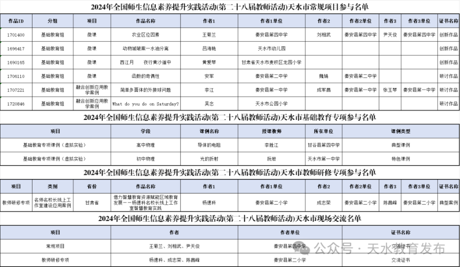 其中常规项目有6件作品分获创新作品、研讨作品称号,占全省作品的10.7%;基础教育专项课例共有2作品分获典型课例、特色课例,占全省作品的40%;教师研修专项有1作品获典型案例称号,占全省作品的20%;常规项目、教师研修专项共2件作品代表甘肃省参加全国现场交流活动,占全省的28.6%,这是我市取得的最好成绩。