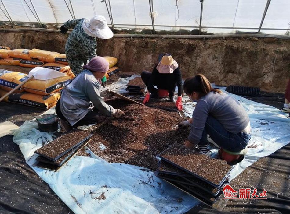 新天水讯 春寒料峭,育苗正忙。时下,走进在甘谷县安远镇辣椒集约化育苗基地,只见工人们正有条不紊地进行装盘、点种、覆膜等作业,一盘盘辣椒苗在温控大棚中整齐排列,孕育着丰收的希望。