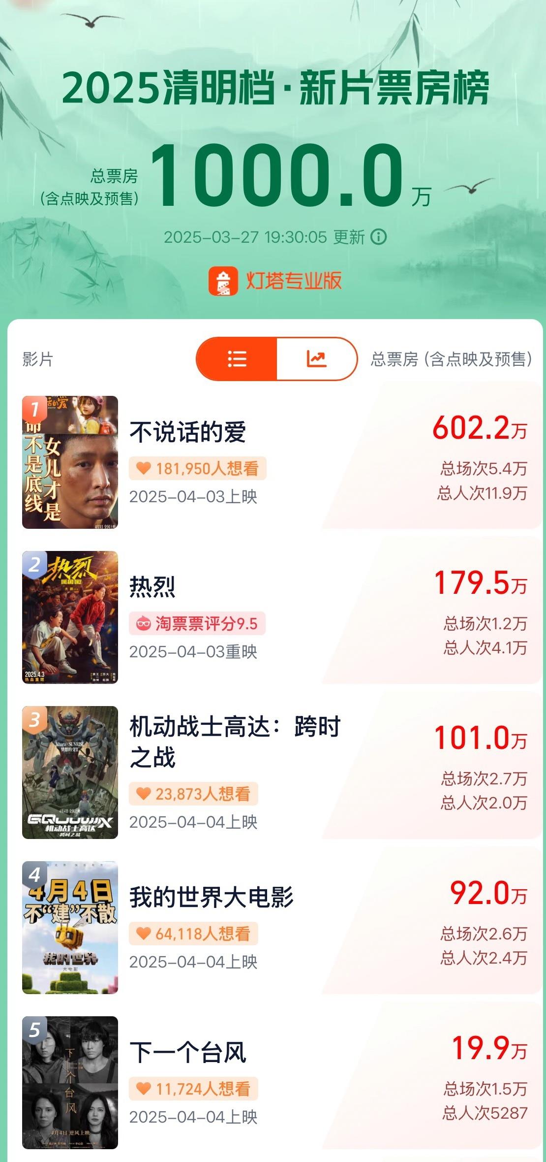 截至3月27日19时30分,2025年清明档新片预售票房(含点映,含重映影片)突破1000万。