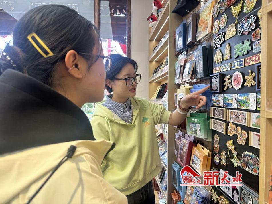甘肃特产购物中心店长武灿介绍,清明假期客流量明显增加,伏羲八卦、木质团龙团凤冰箱贴、甘肃地图文创等富含天水文化特色的产品备受青睐。此外,店内推出以甘肃特色食品为主的优惠活动,希望让游客品尝地道风味。
