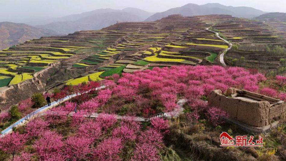 最美人间四月天。当下,武山县城关镇雷山村山上的寒红桃、碧桃开的正艳,一颗颗粉红的桃树花团锦簇、鲜亮娇艳,像围绕在山间的云霞,散发着清幽淡雅的香气,与不远处梯田间金黄的油菜花相互映衬,碰撞出春日的浪漫胜景,吸引着人们打卡漫步。(通讯员王正平 赵超 管秋勇 摄)