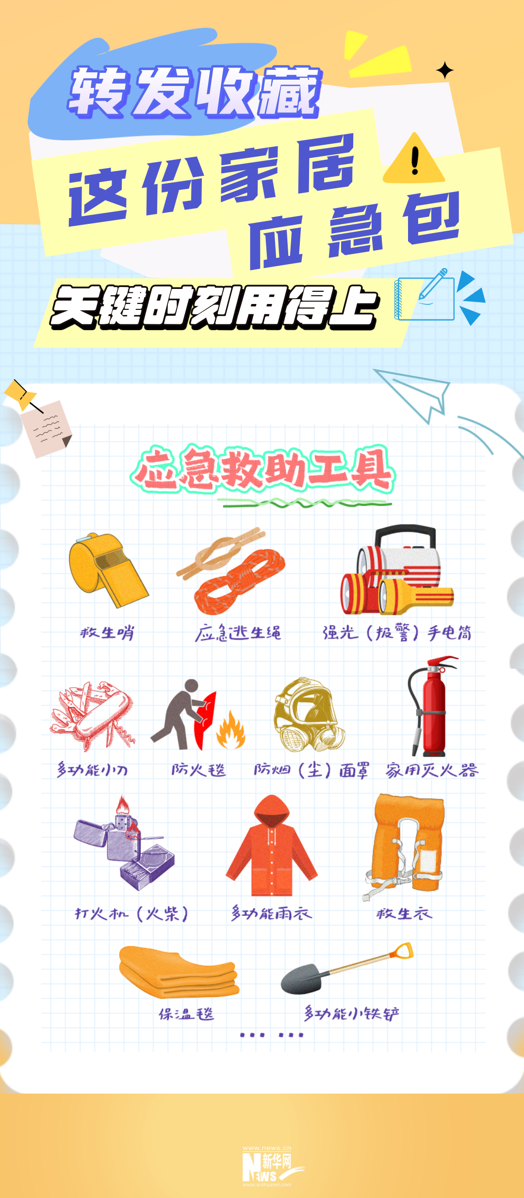 手电筒、救生哨、应急逃生绳、瓶装水、饼干、罐头、创可贴、碘伏棉棒……发生灾情时,自救是最迅速有效的。日常居家,应准备哪些应急物品?2025年5月12日是第17个全国防灾减灾日,转发收藏这份“应急包”,关键时刻用得上!