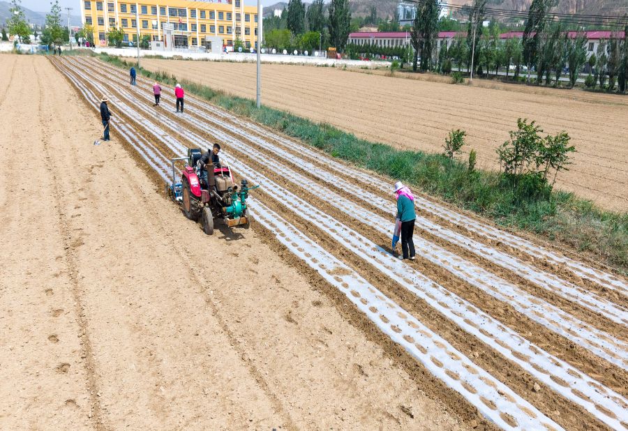 5月22日,在甘肃省庆阳市环县曲子镇五里桥村,村民们抢抓雨后墒情一边覆膜一边点播大豆(无人机照片)。 新华社记者 郎兵兵 摄