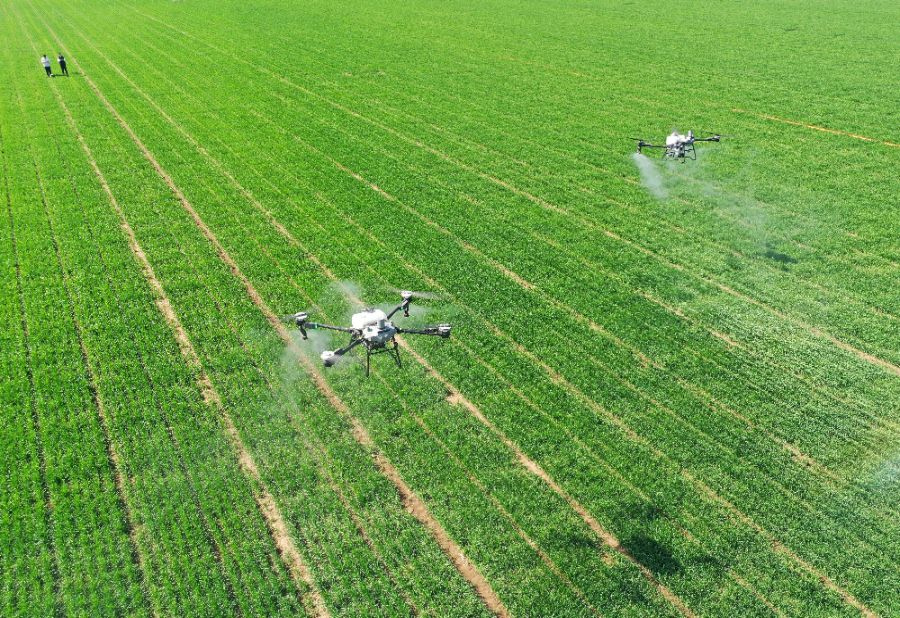 4月6日,在山东省青岛市即墨区段泊岚镇瓦戈庄村绿色增粮先行示范区,农民采用植保无人机为小麦喷洒叶面肥(无人机照片)。新华社发(梁孝鹏摄)