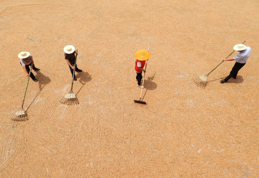 5月16日,在四川省达州市渠县文崇镇学堂村,种粮大户在晾晒刚收获的小麦。新华社发(邓良奎摄)