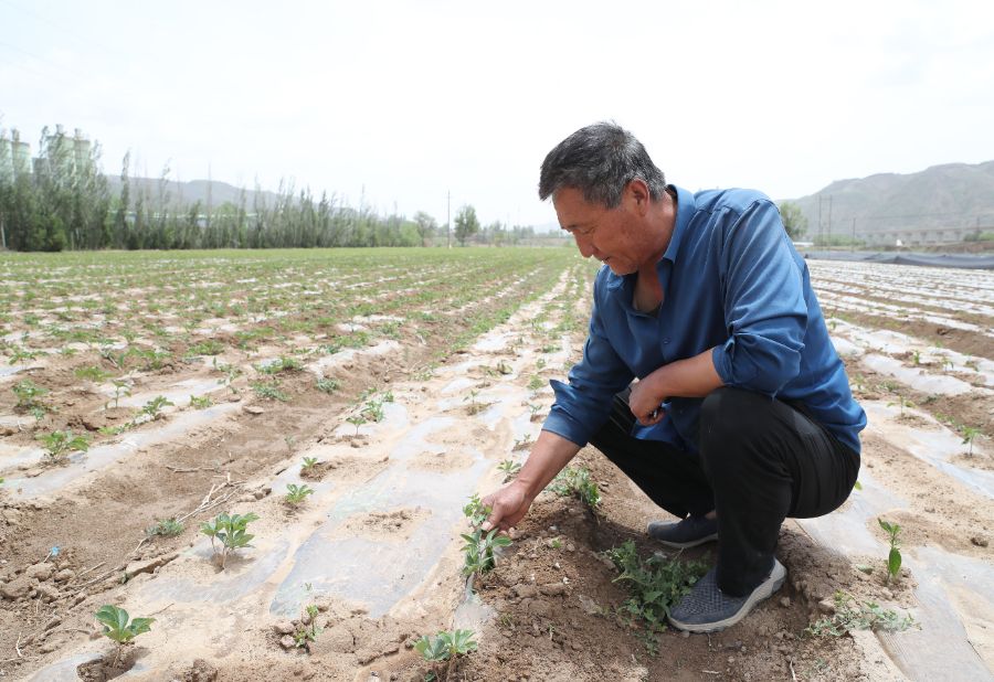 5月22日,在甘肃省庆阳市环县曲子镇五里桥村,村民察看农作物生长情况。新华社记者 郎兵兵 摄