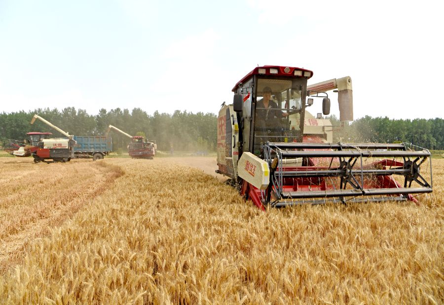 5月24日,在山东省临沂市平邑县地方镇,农机手驾驶收割机在田间收割小麦。新华社发(武纪全摄)