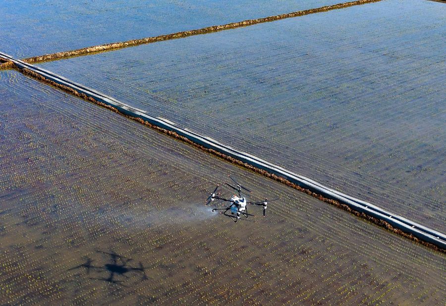 5月23日,在北大荒农业股份有限公司八五六分公司第五管理区,搭载北斗卫星导航系统的植保无人机为水稻喷施防虫药剂(无人机照片)。新华社发(黄永兴摄)