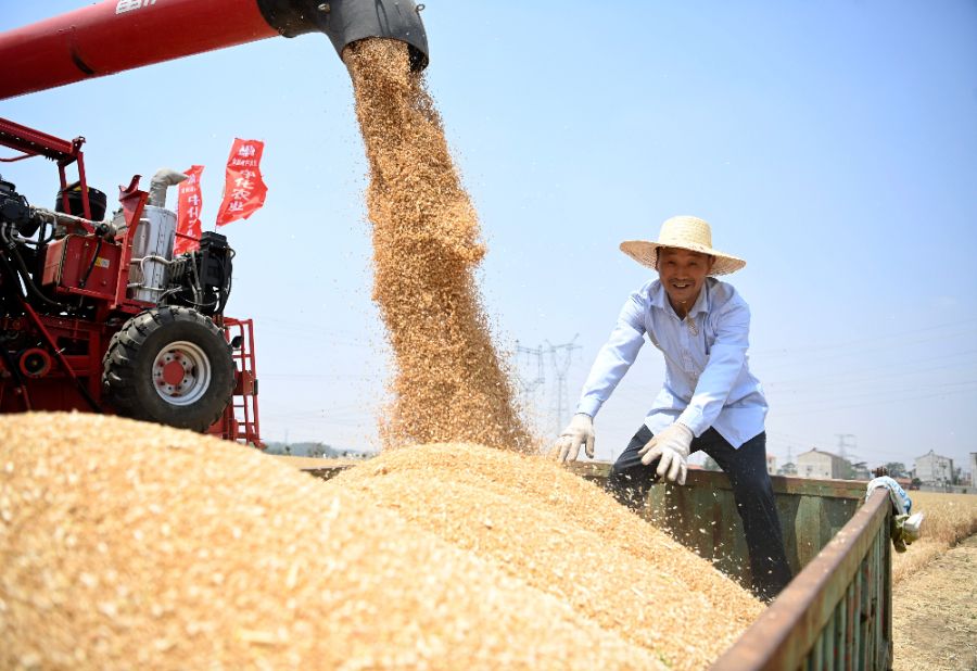 5月21日,在湖北省襄阳市襄州区古驿镇原种场一队,小麦“三优两增一稳”示范片在进行机收作业。新华社发(谢勇摄)