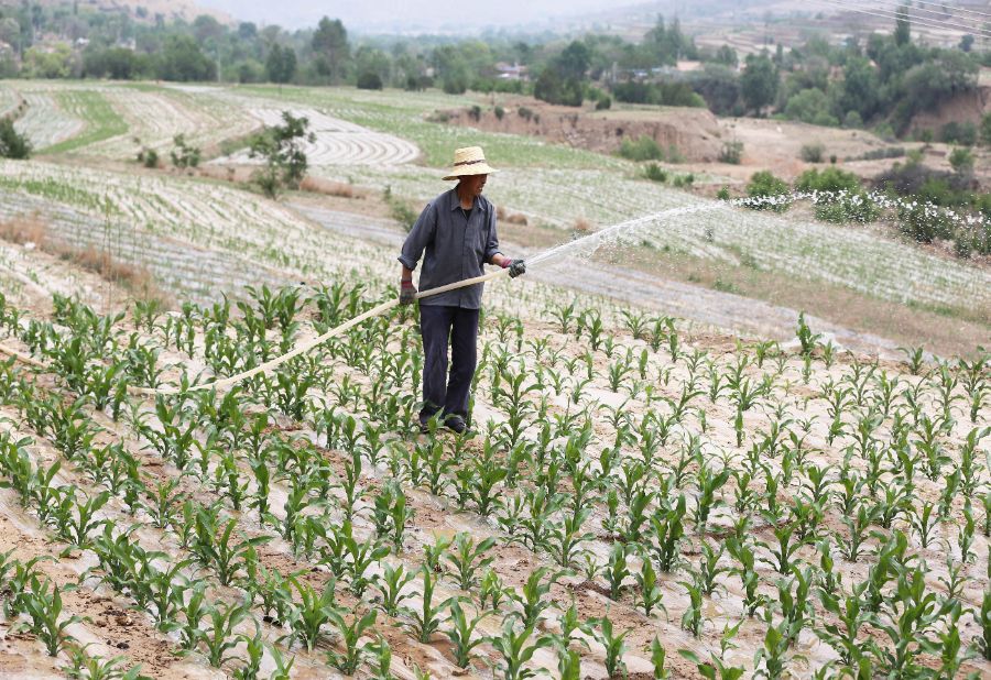 5月21日,在甘肃省定西市通渭县寺子川乡,农民给玉米地浇水。新华社发(王克贤摄)