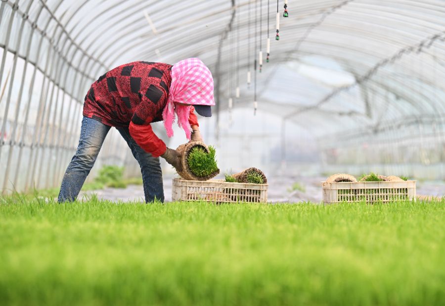 5月8日,农民在天津市优农中心试验基地大棚内起秧苗。新华社记者 孙凡越 摄