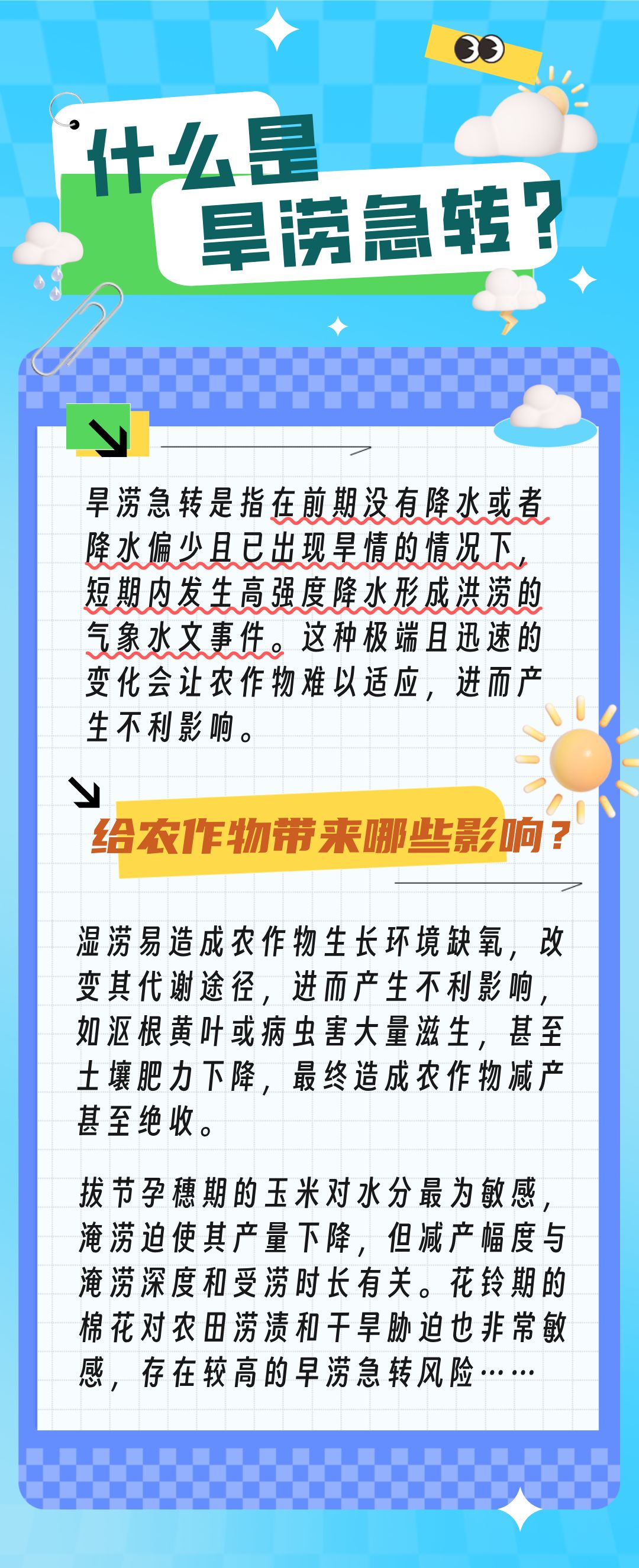 旱涝急转风险需早应对。多位农业气象专家表示,如遇旱涝急转,要做好农田渍涝预防、病虫害防治和作物灾后补救工作。