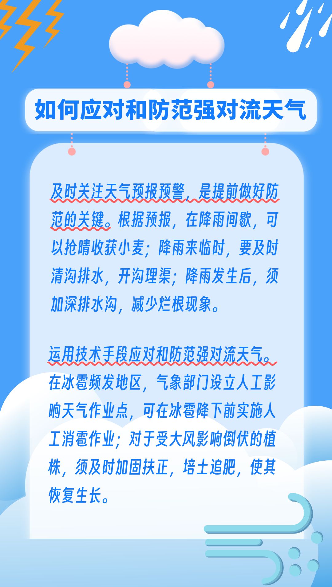 在这种剧烈对流中产生的天气现象,突发性强、破坏力大。如雷暴大风易导致农作物倒伏,暴雨会造成农作物被淹,冰雹常常砸毁农作物,甚至使其绝收。