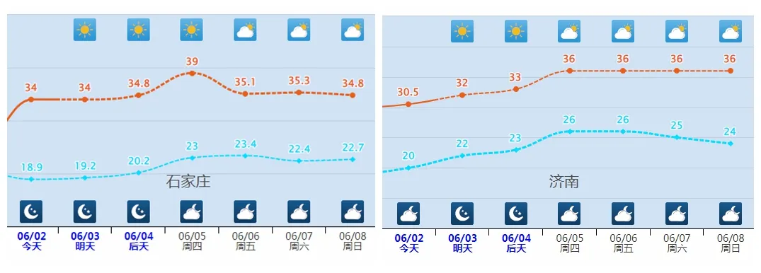 华北、黄淮部分地区的炎热还将加码,5日至6日,35℃以上的高温范围将会明显扩大。像是石家庄、济南、郑州,将连续出现3至5天高温天气。