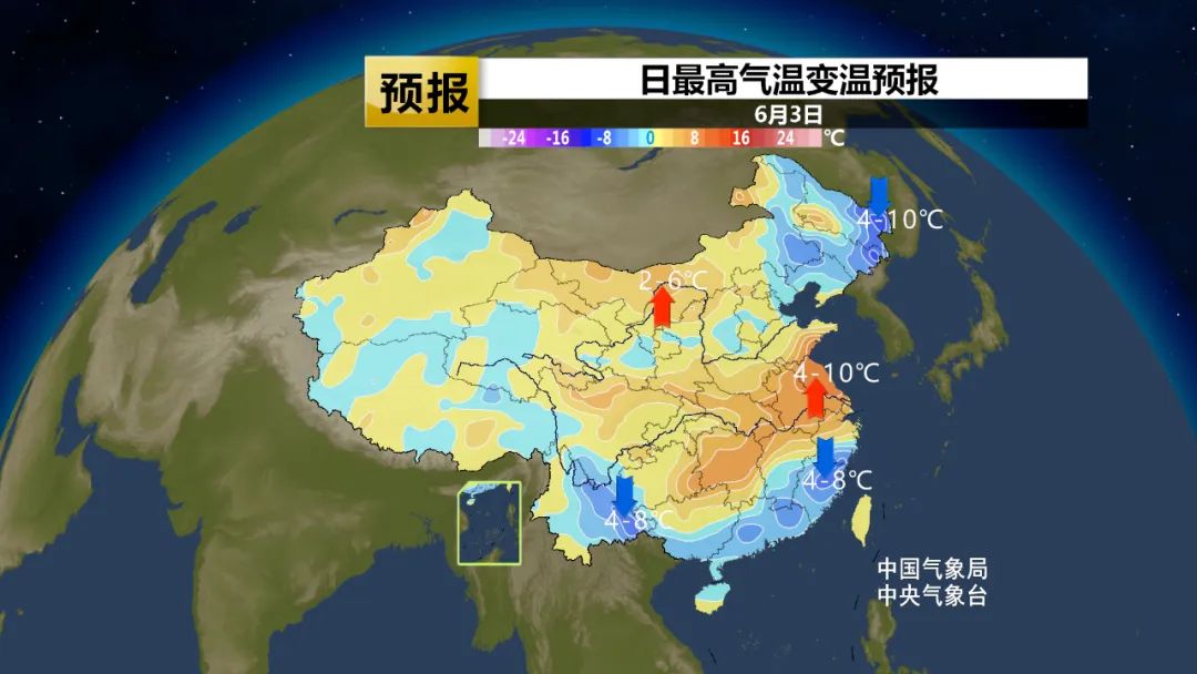 今天(6月3日),从内蒙古到贵州、湖南、江西等大部地区气温都将继续上升,安徽、江苏等地部分地区升温幅度可到4℃至10℃。