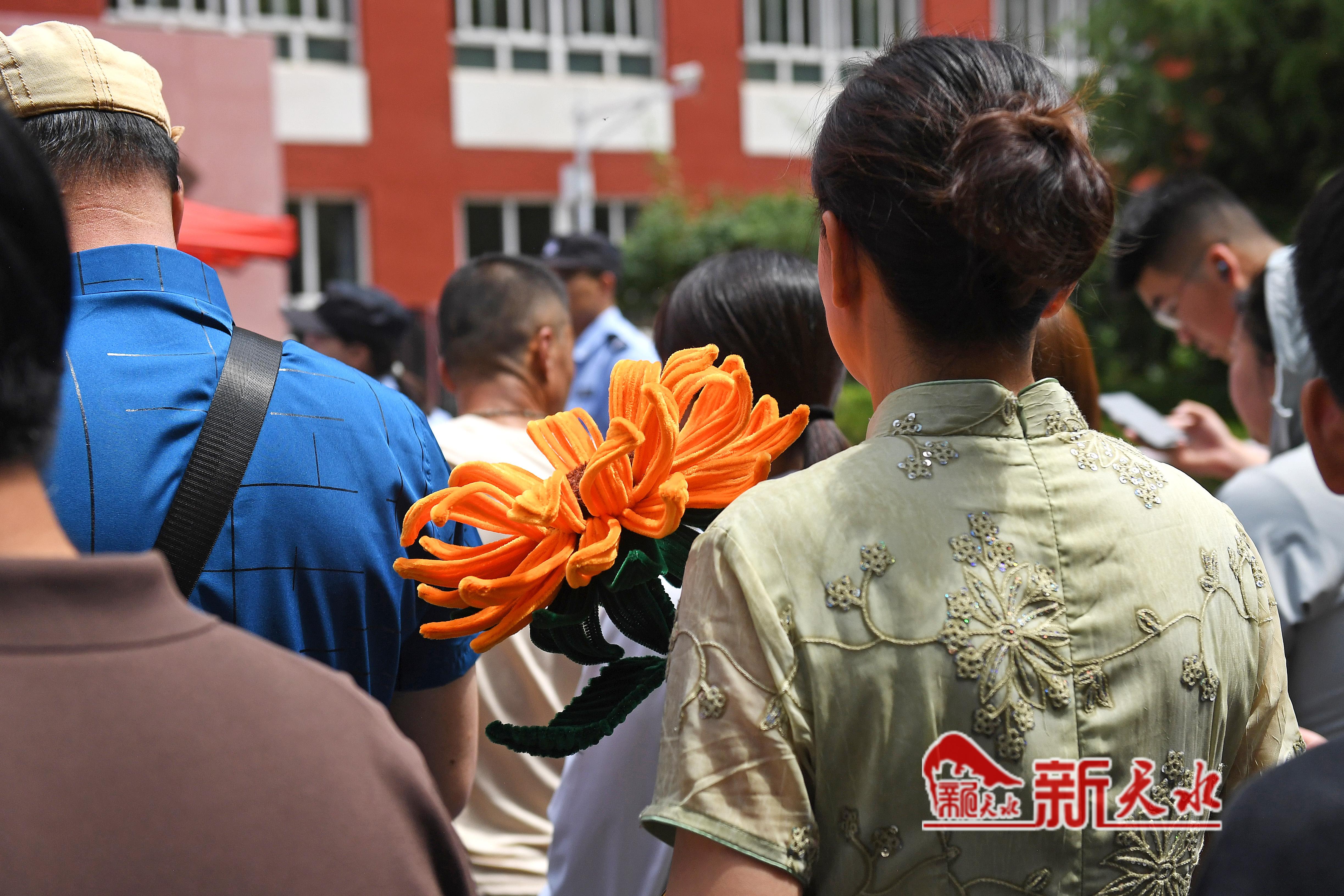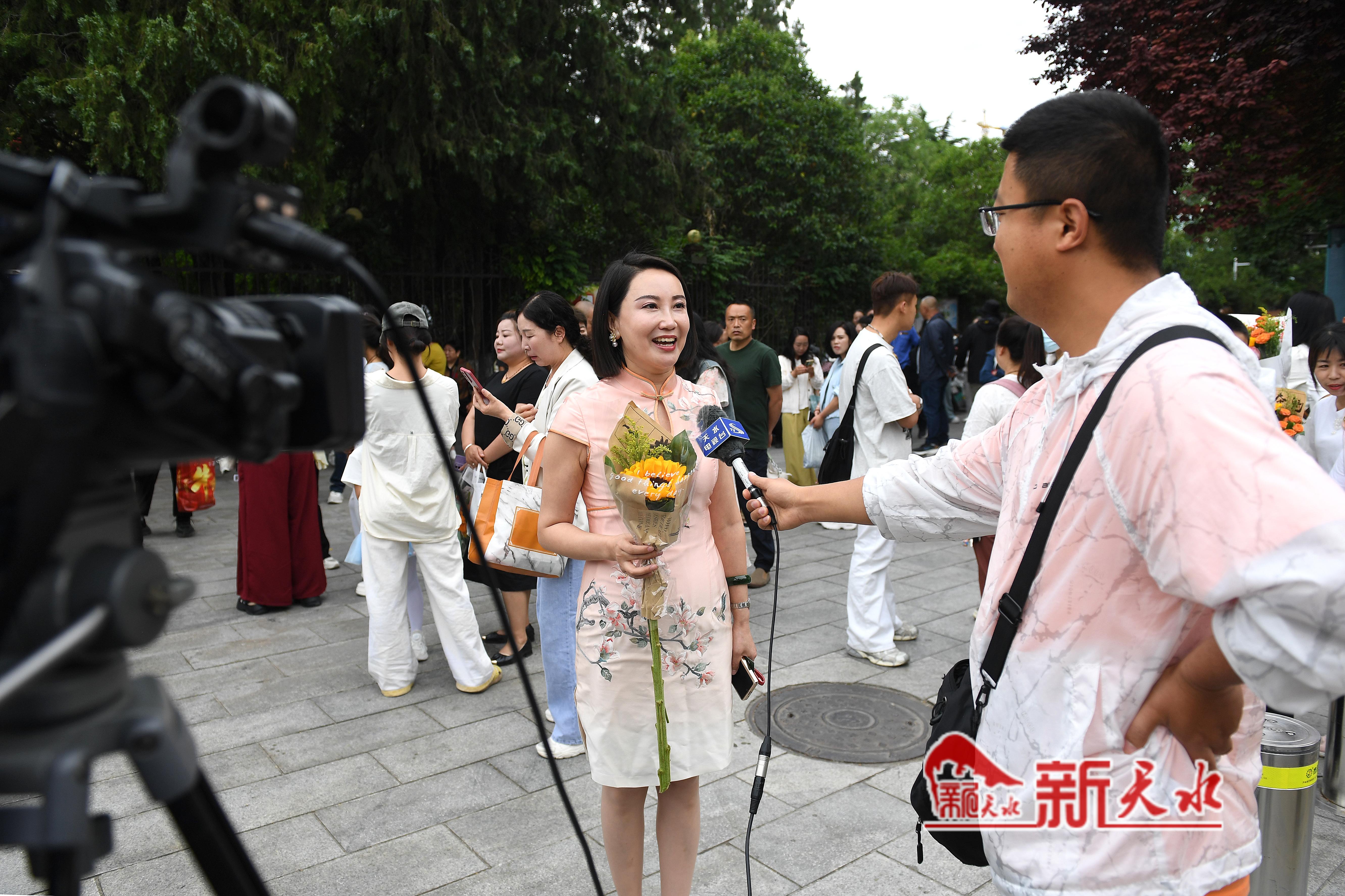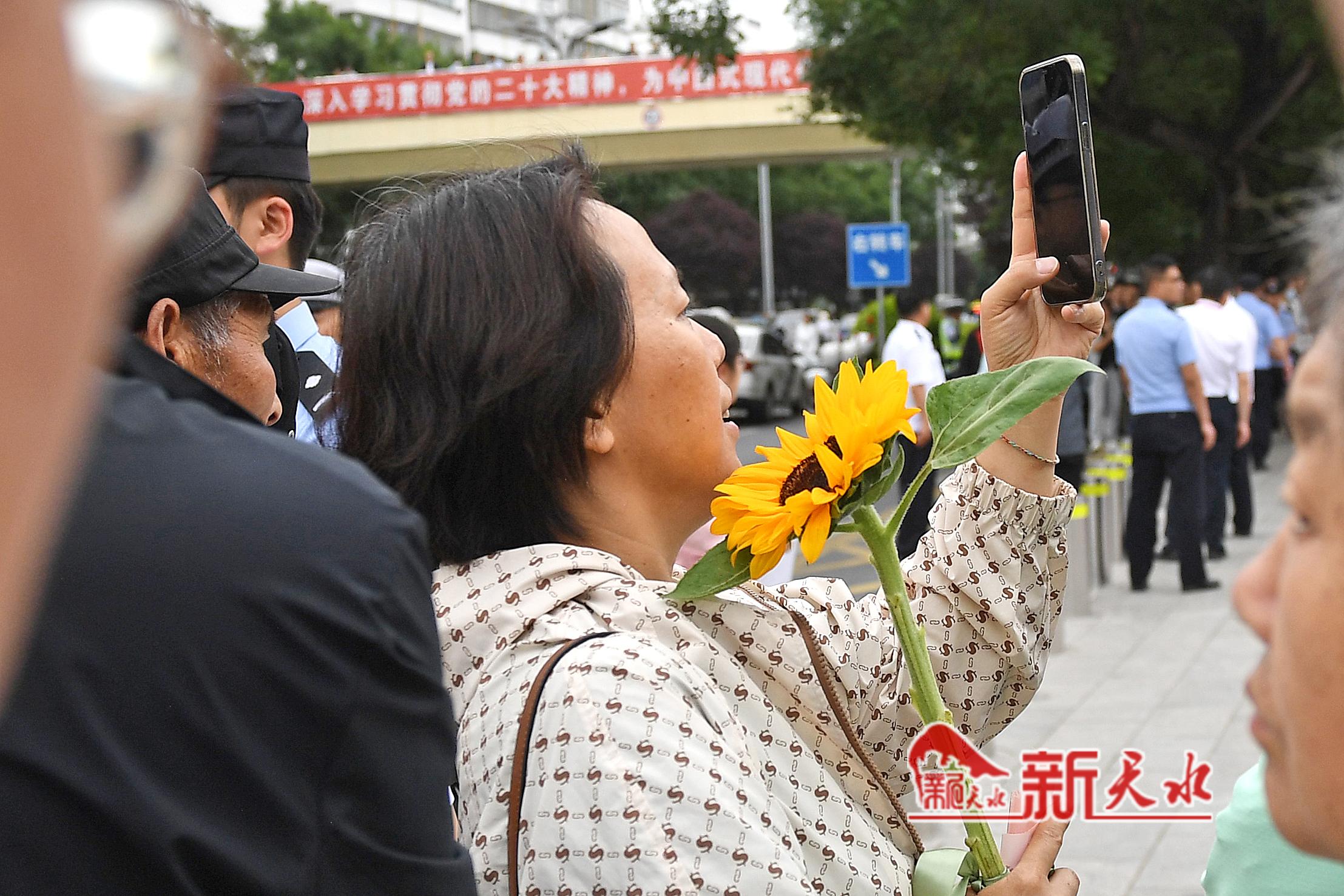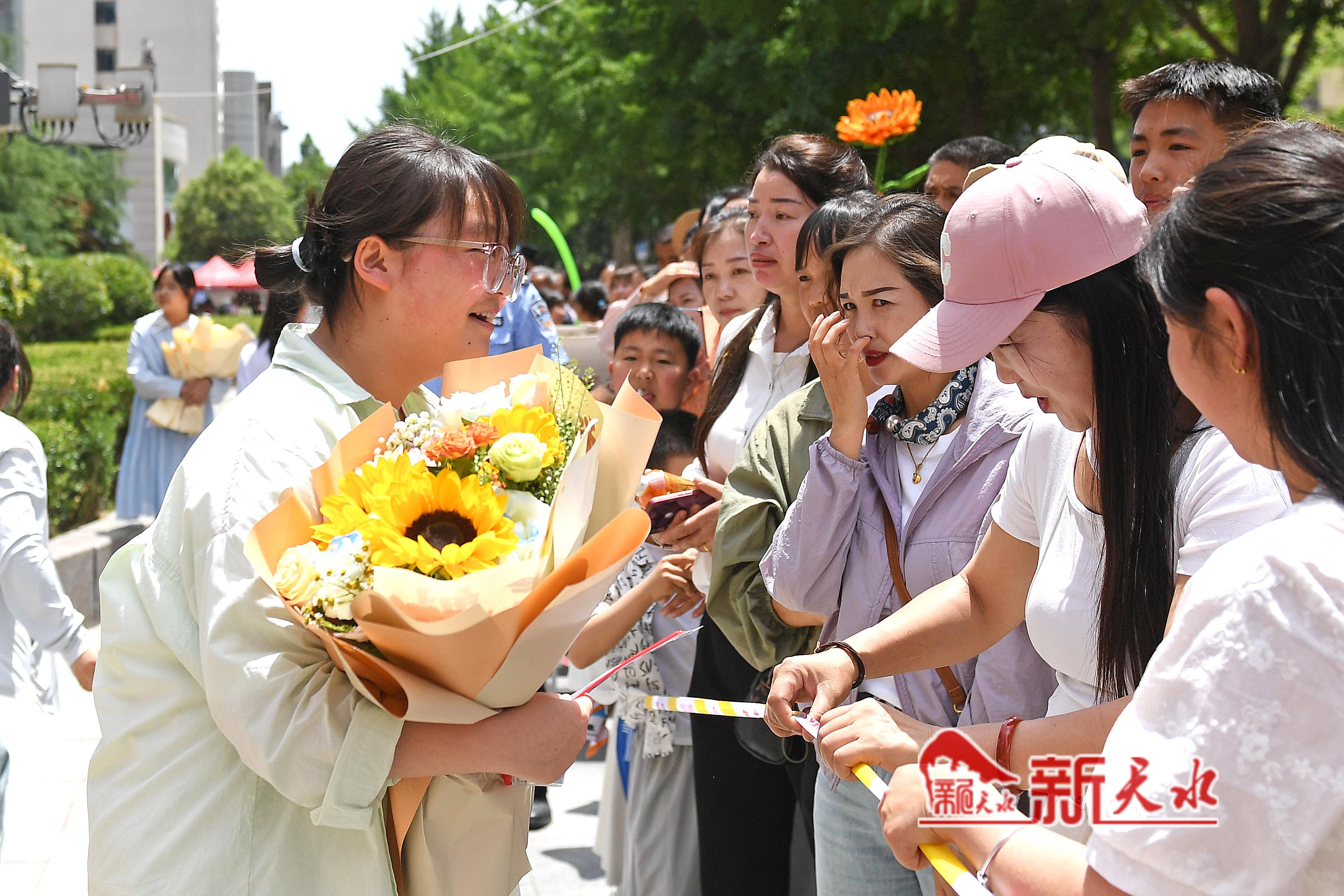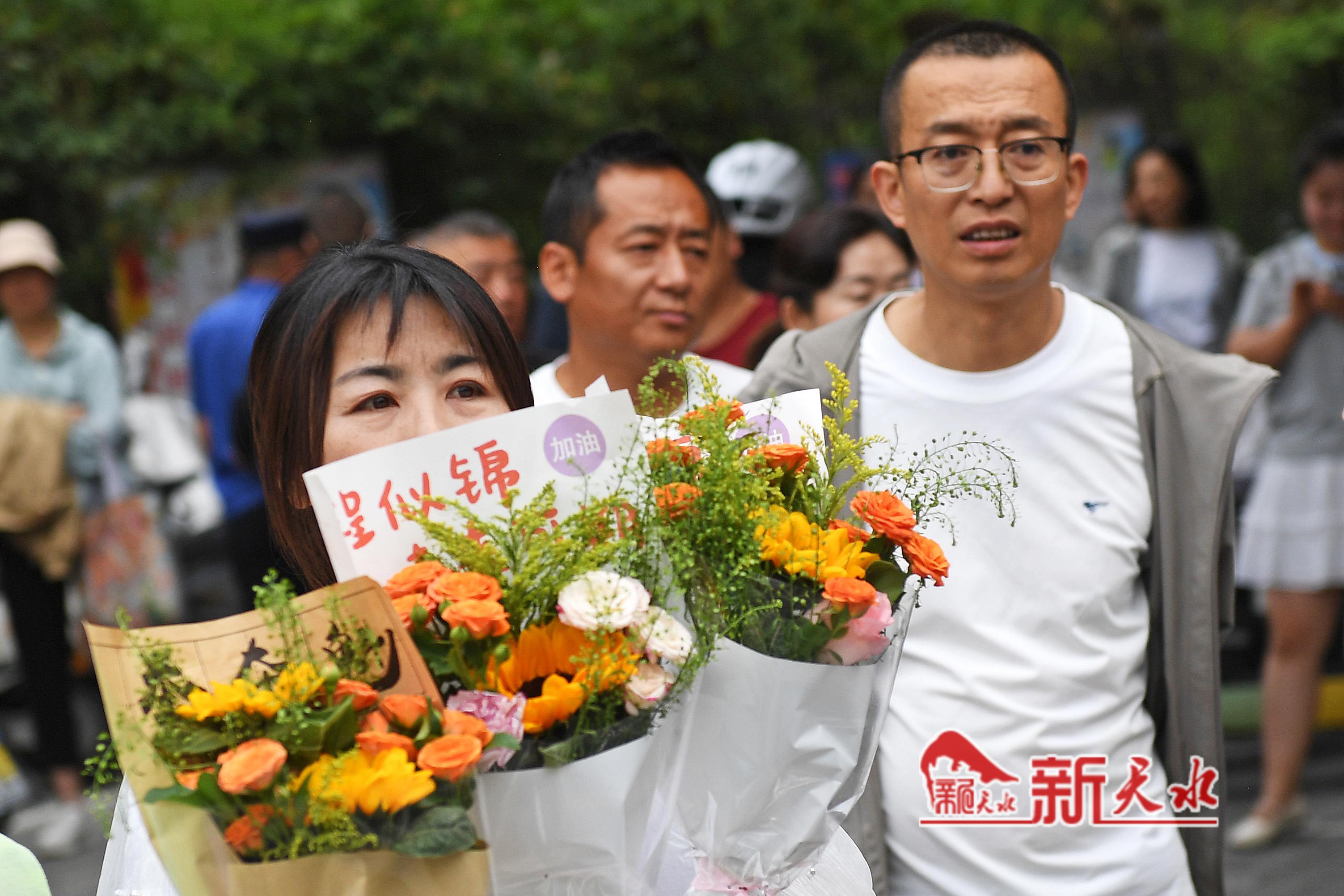 当天,在市一中、市五中和市一中秦州分校考点外,一些考生母亲特意穿了旗袍、手捧鲜花和向日葵等孩子出考场,祝愿考生旗开得胜、一举夺魁。