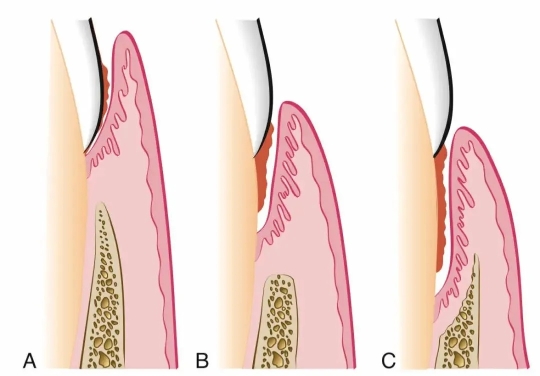 此外,制作不良的修复体比如贴面、牙冠等也可能形成难以清洁的卫生死角,进而增加炎症产生,导致牙龈附着的丧失和牙槽骨吸收。
