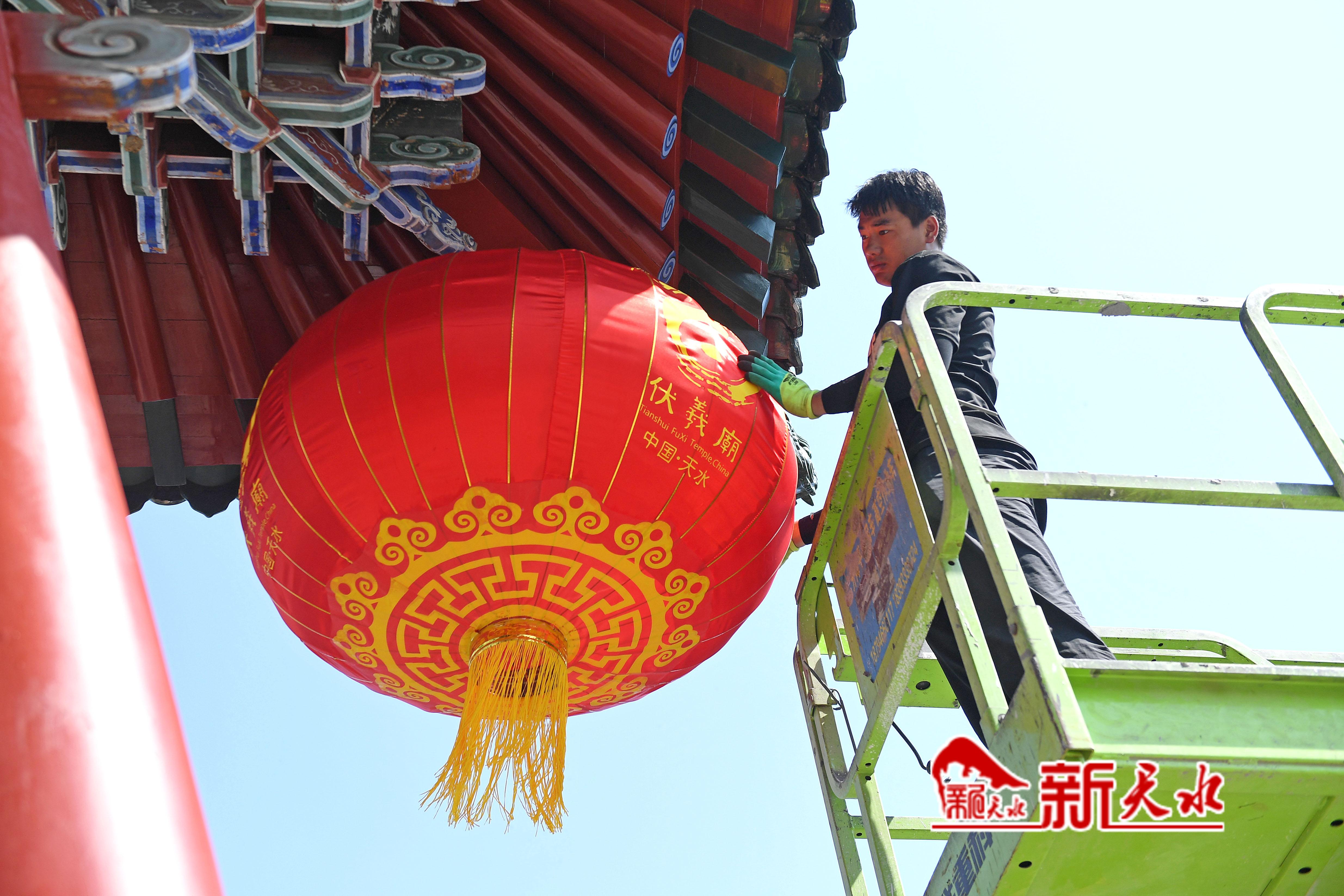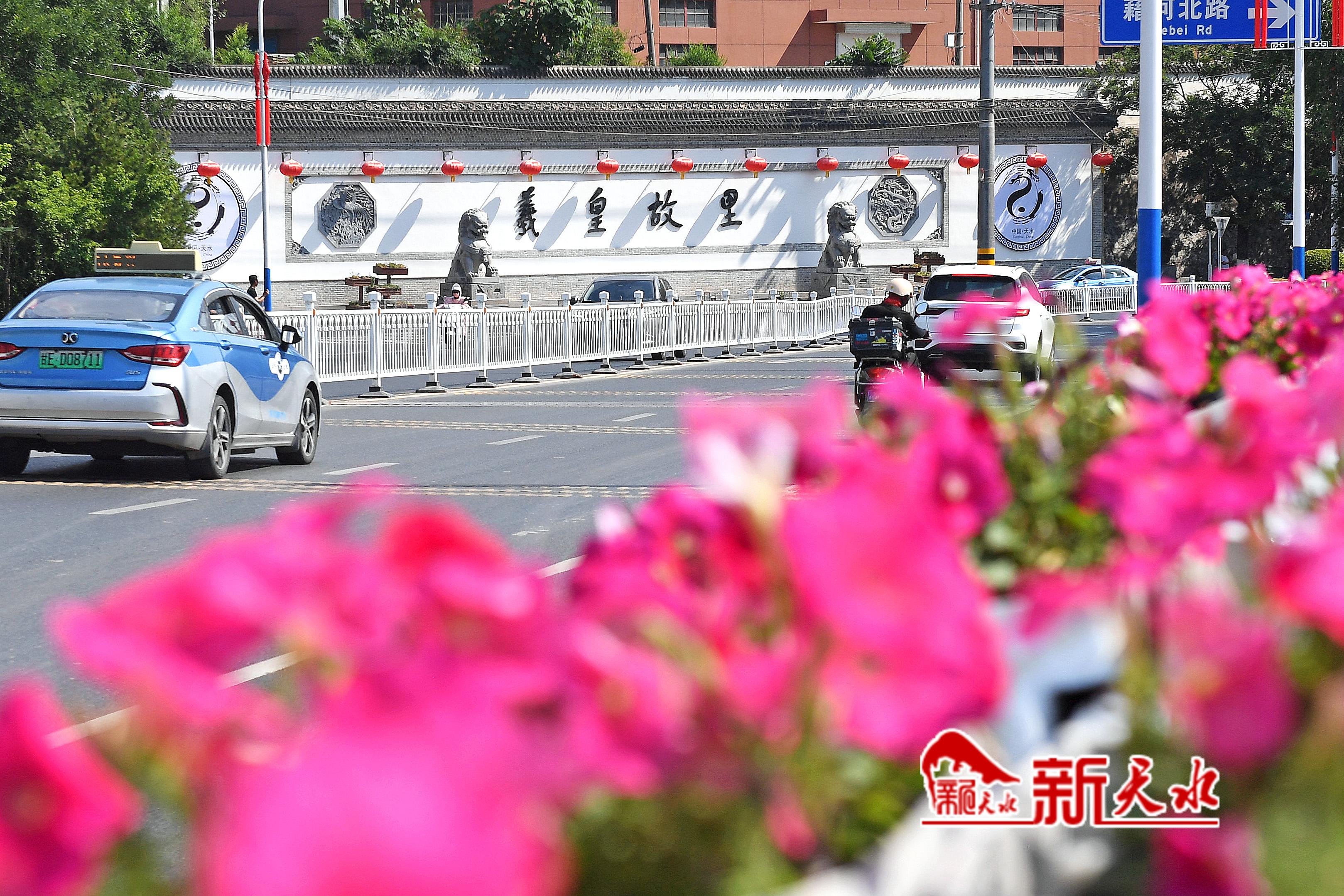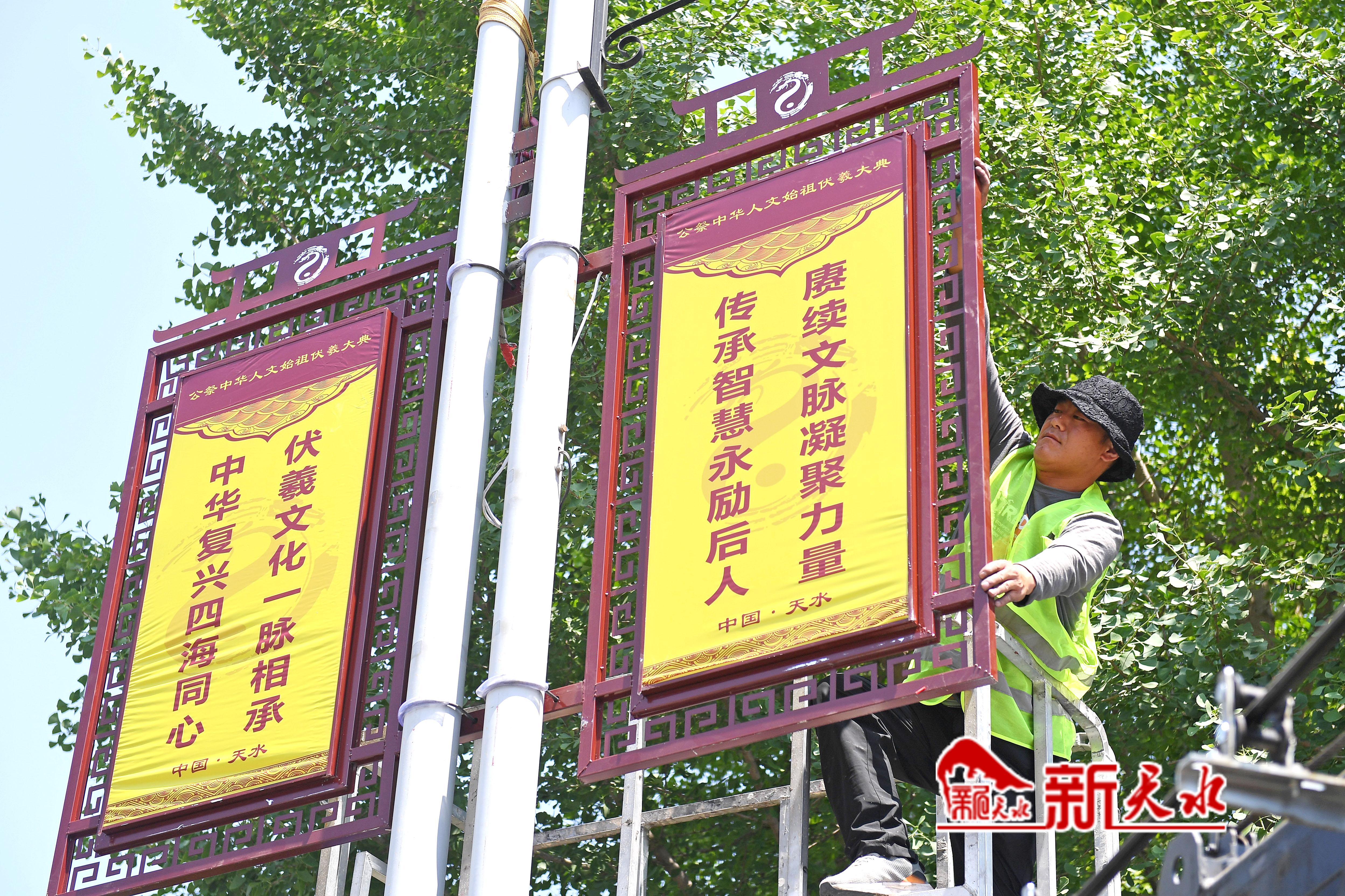 6月12日,工人在油漆秦州区瀛池大桥护栏;伏羲城内悬挂起红灯笼;车辆经过鲜花装扮的瀛池大桥和秦麦高速公路出口;工作人员在安装印有弘扬伏羲文化内容的灯杆宣传牌。