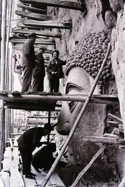 麦积山石窟东崖大佛修复前调查。图源:新华社