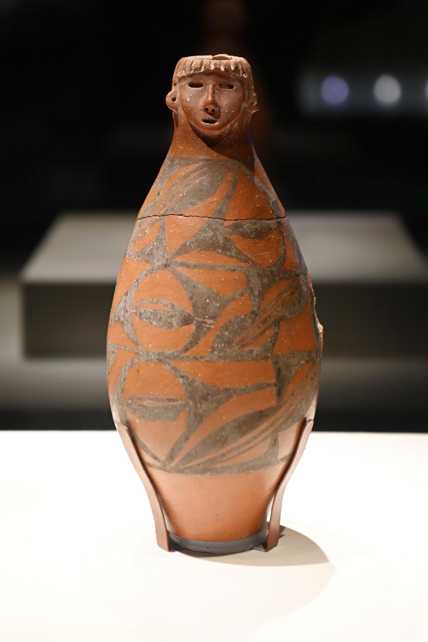 图为大地湾出土的人头形器口彩陶瓶。新华社记者范培珅/摄