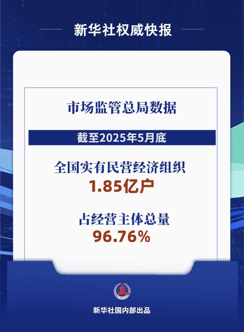 市场监管总局数据显示,截至2025年5月底,全国实有民营经济组织1.85亿户,占经营主体总量的96.76%,同比增长2.3%。其中,民营企业数量突破5800万户,同比增长5.2%;个体工商户达1.27亿户,同比增长1%。