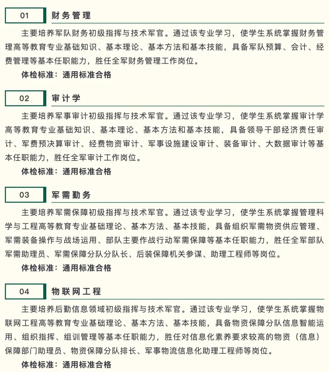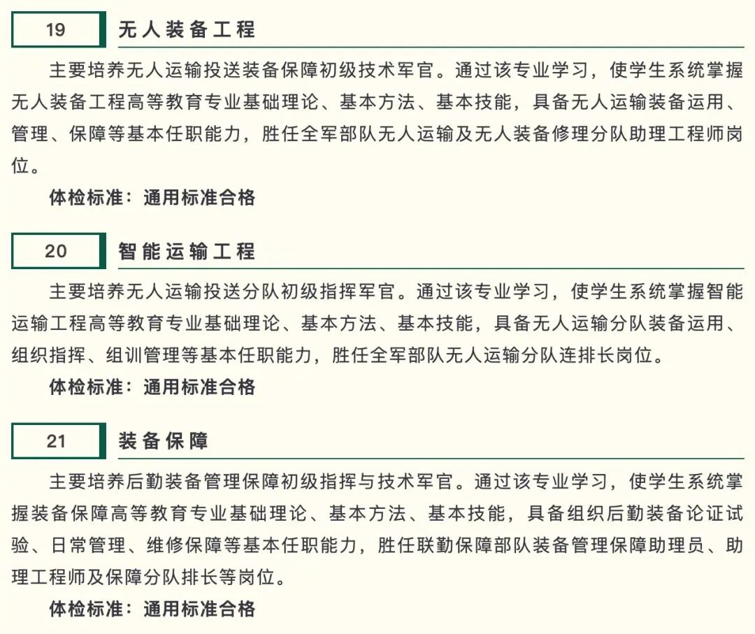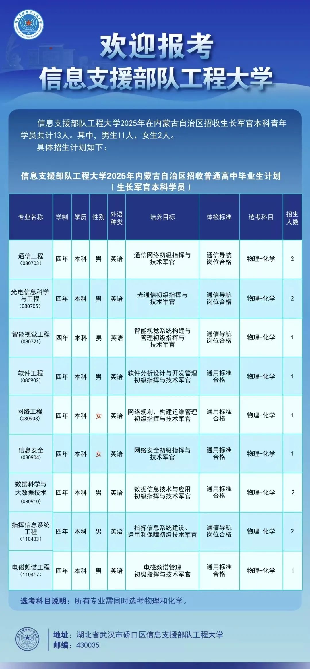 信息支援部队工程大学2025年在北京、河北、内蒙古、辽宁、吉林、江苏、安徽、江西、山东、河南、湖北、湖南、重庆、四川、陕西等15个省份(自治区、直辖市)面向普通高中毕业生招收401名生长军官本科学员。其中:男生345人,女生56人。