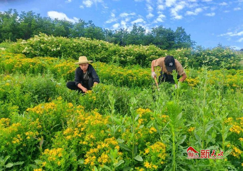 贯叶连翘被誉为“山中的黄金”。龙台山凭借其高海拔、气候温凉、光照充足、生态环境优良的独特自然禀赋,成为高品质贯叶连翘的理想产地。龙山村将贯叶连翘产业作为推动乡村振兴、壮大村集体经济的特色主导产业重点培育。种植过程中,大力推广标准化种植技术,从选地、育苗、移栽、田间管理到采收,邀请专家全过程提供技术指导和培训,确保药材质量。 “今年的丰收来之不易,也格外喜人。最近我们一直联系收购商,商议价格,确定好后组织群众收割。”龙山村党支部书记康乐乐说。望着眼前这片金色的希望田野,康乐乐充满信心,贯叶连翘产业已经成为龙山村壮大村集体经济的“金钥匙”。