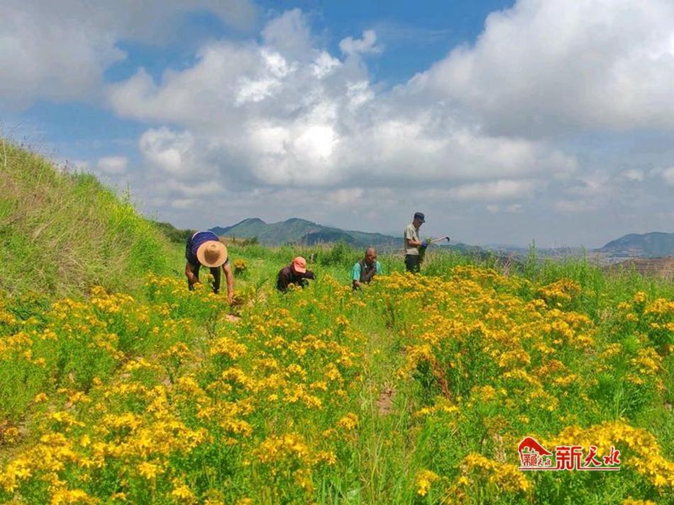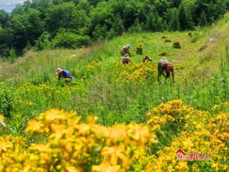 眼下,正是贯叶连翘的最佳采收季,村民穿梭于金色的花田间,熟练地挥动镰刀,收割着这份来自高山的珍贵馈赠。 “去年四月份种了200亩的贯叶连翘,到十月份收割了一茬,将近10000斤,卖了11000元。今年这段时间降雨,加上科学管理,贯叶连翘长势特别好。”龙山村党支部副书记于江成捧起一把刚割下的贯叶连翘,枝叶间缀满饱满的小黄花,茎叶油绿、品质上乘。据于江成介绍,为发展壮大村集体经济,去年龙山村根据自然优势种植贯叶连翘,第一年就取得不错收益。今年两茬预计鲜贯叶连翘产量能超过5000公斤,按照当前市场行情,收入相当可观。