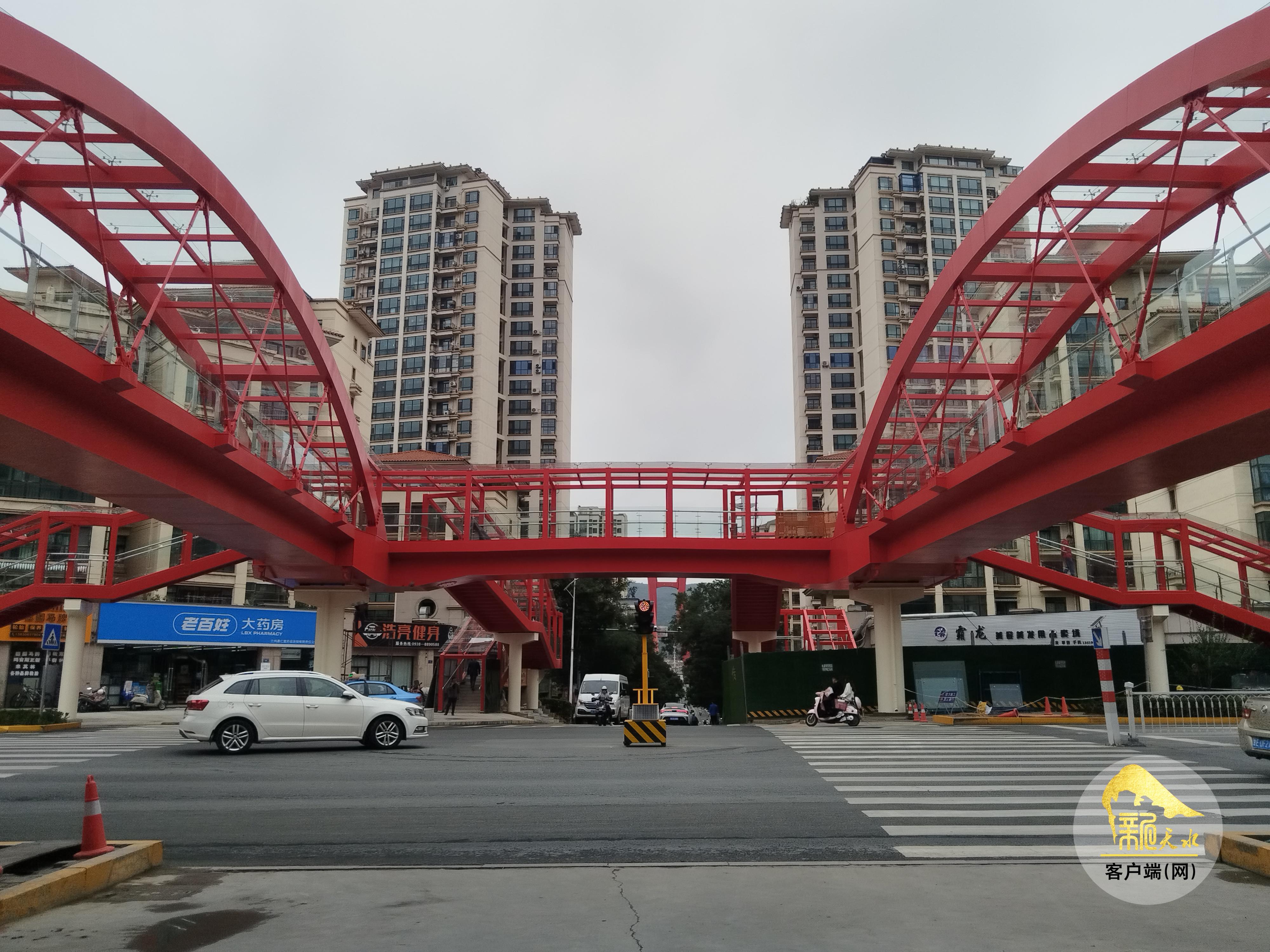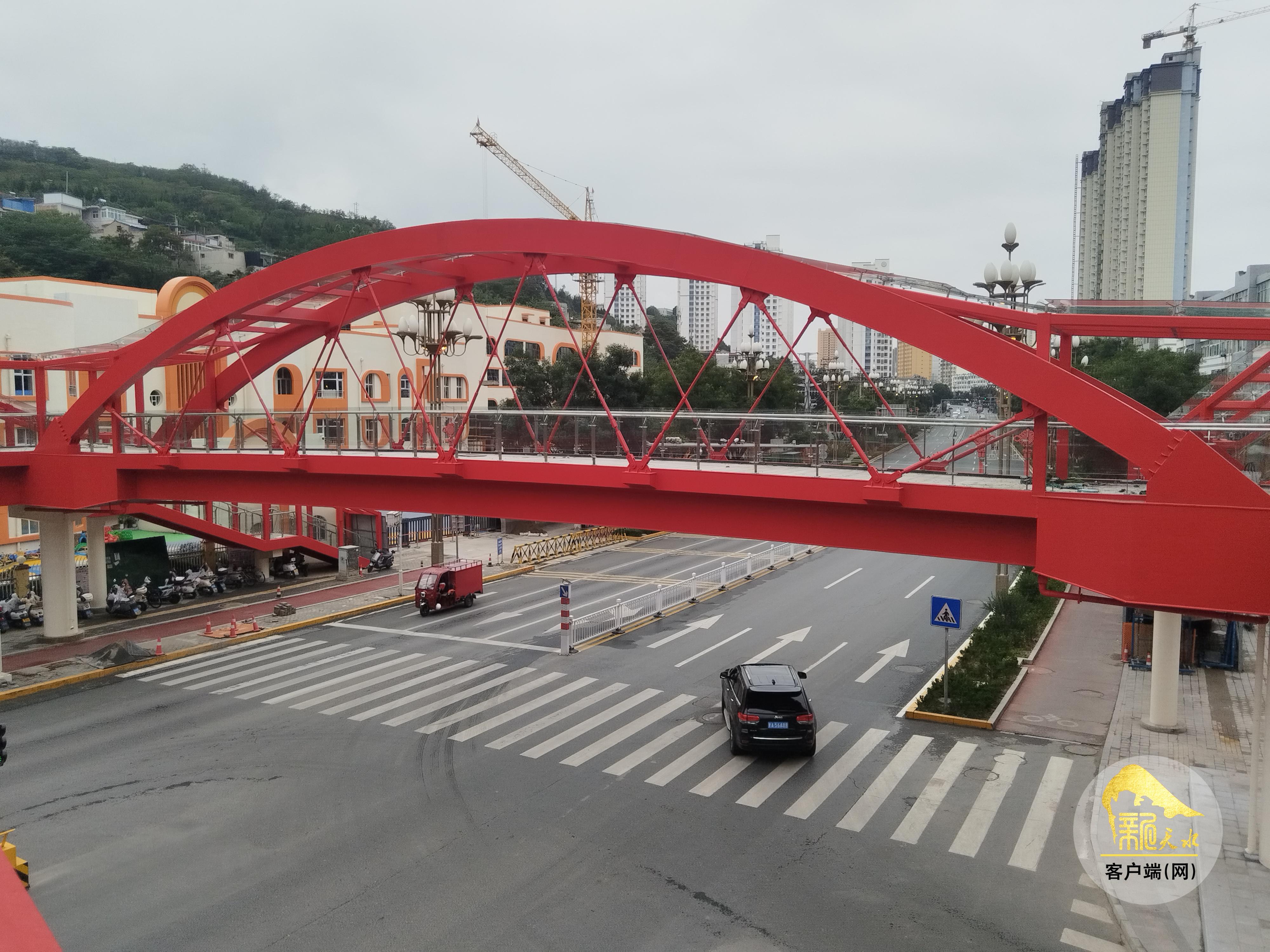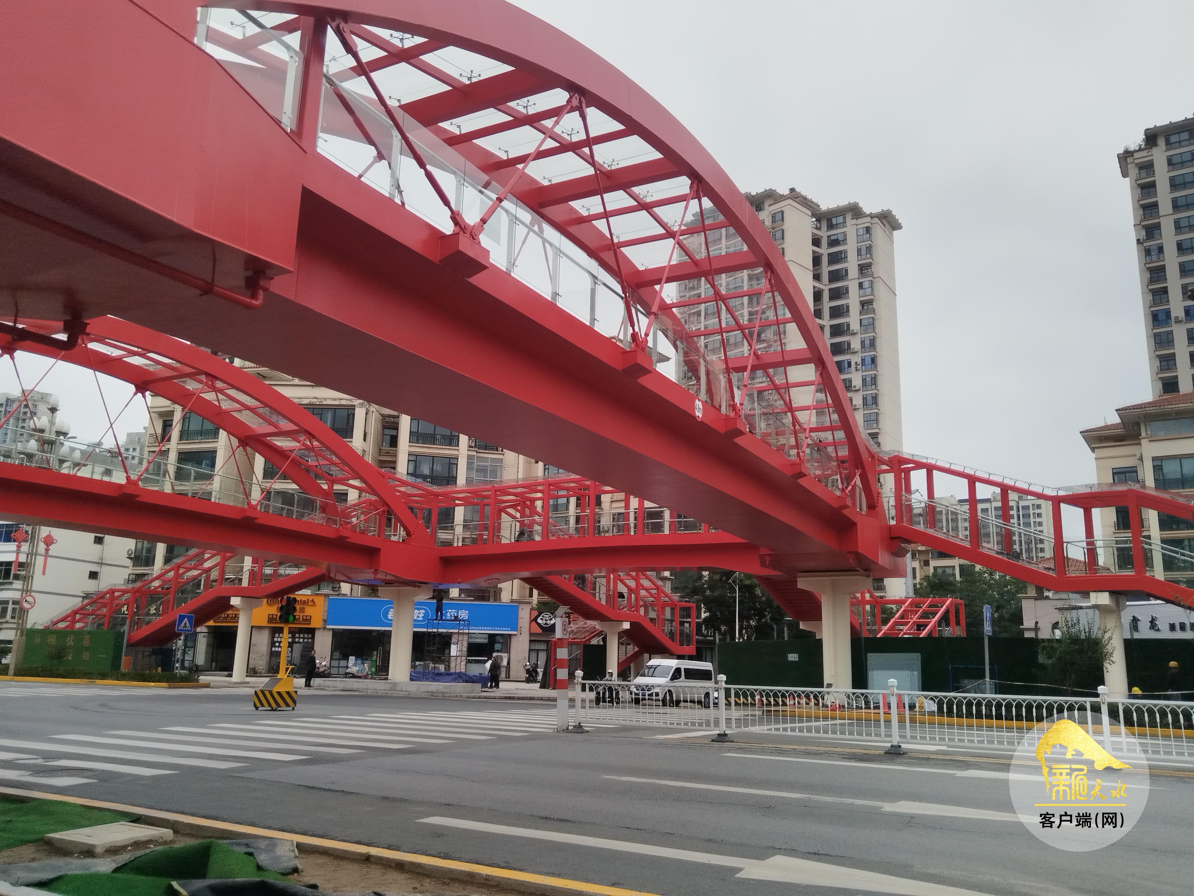 9月10日,记者来到位于秦州区羲皇大道与天庆路的交叉口处,只见一座崭新的红色人行天桥以“口”字形布置,将羲皇大道南北两面以及天庆路东西两面连通起来,施工人员正进行安装部分梯道的雨棚及收尾工作。因为天桥的东面已经具备了通行条件,为方便开学后附近学校、幼儿园师生的通行,天桥东面已经局部提前投入使用,不时有行人通过。放眼望去,整个人行天桥与天庆路以北的红桥遥相呼应。
