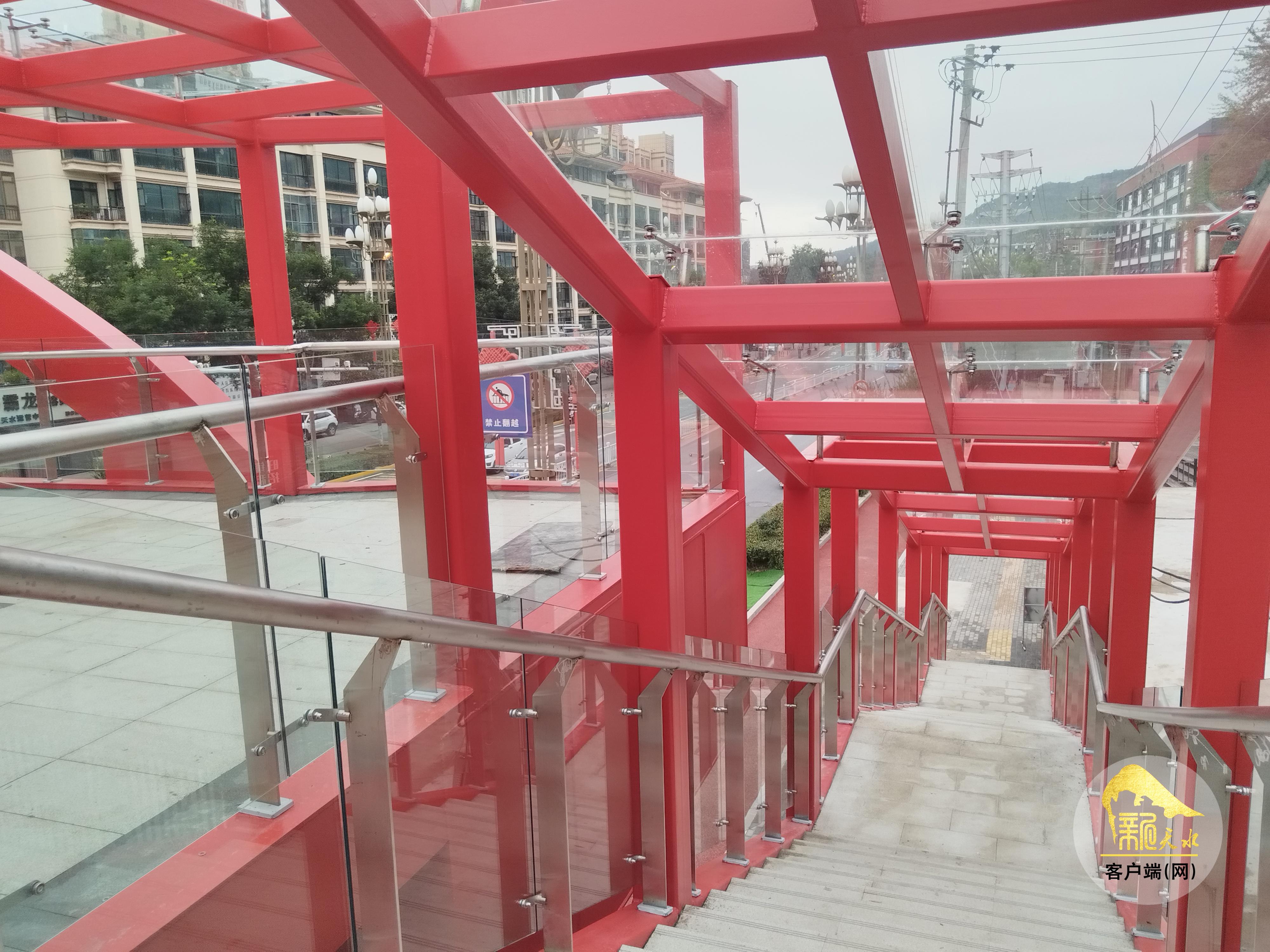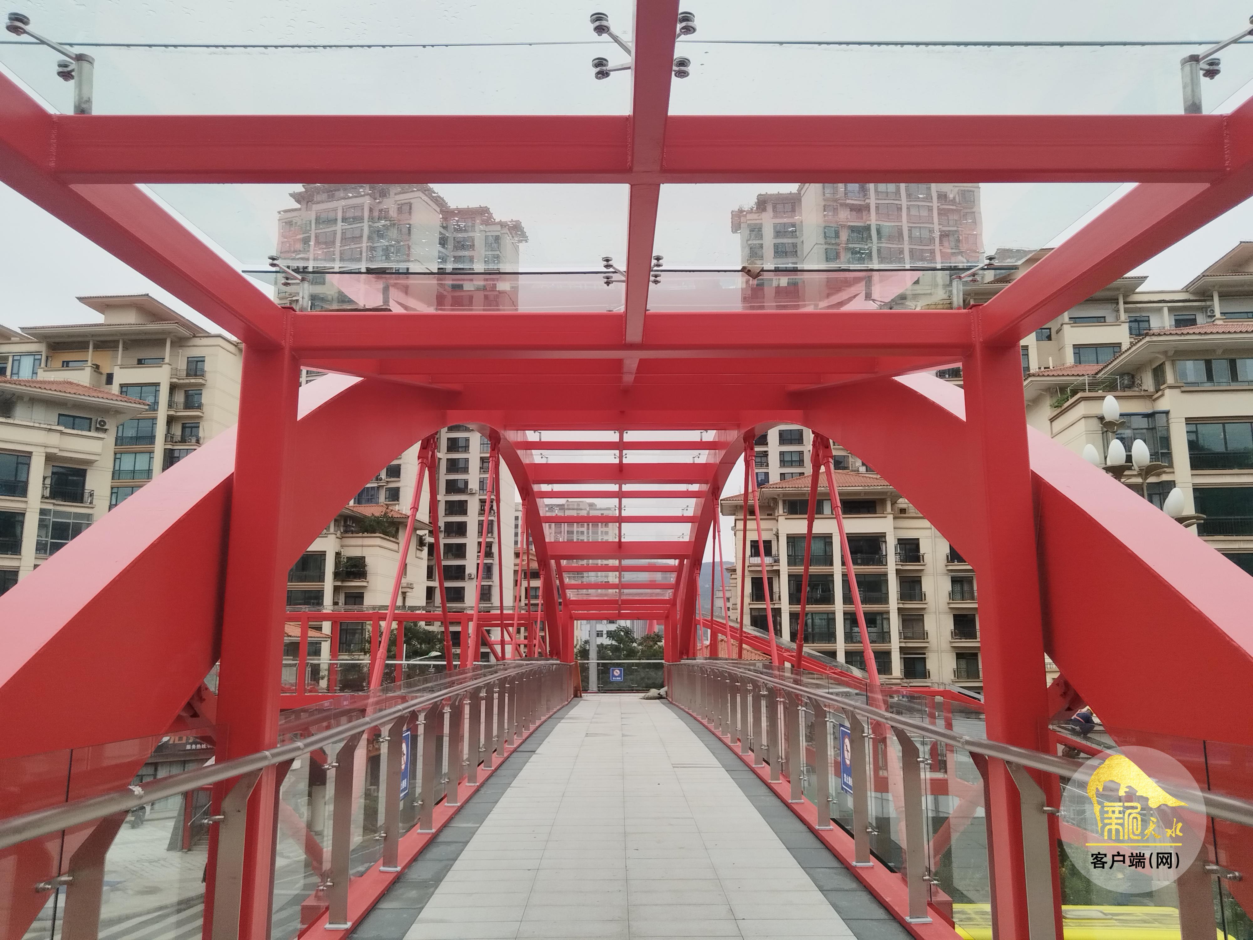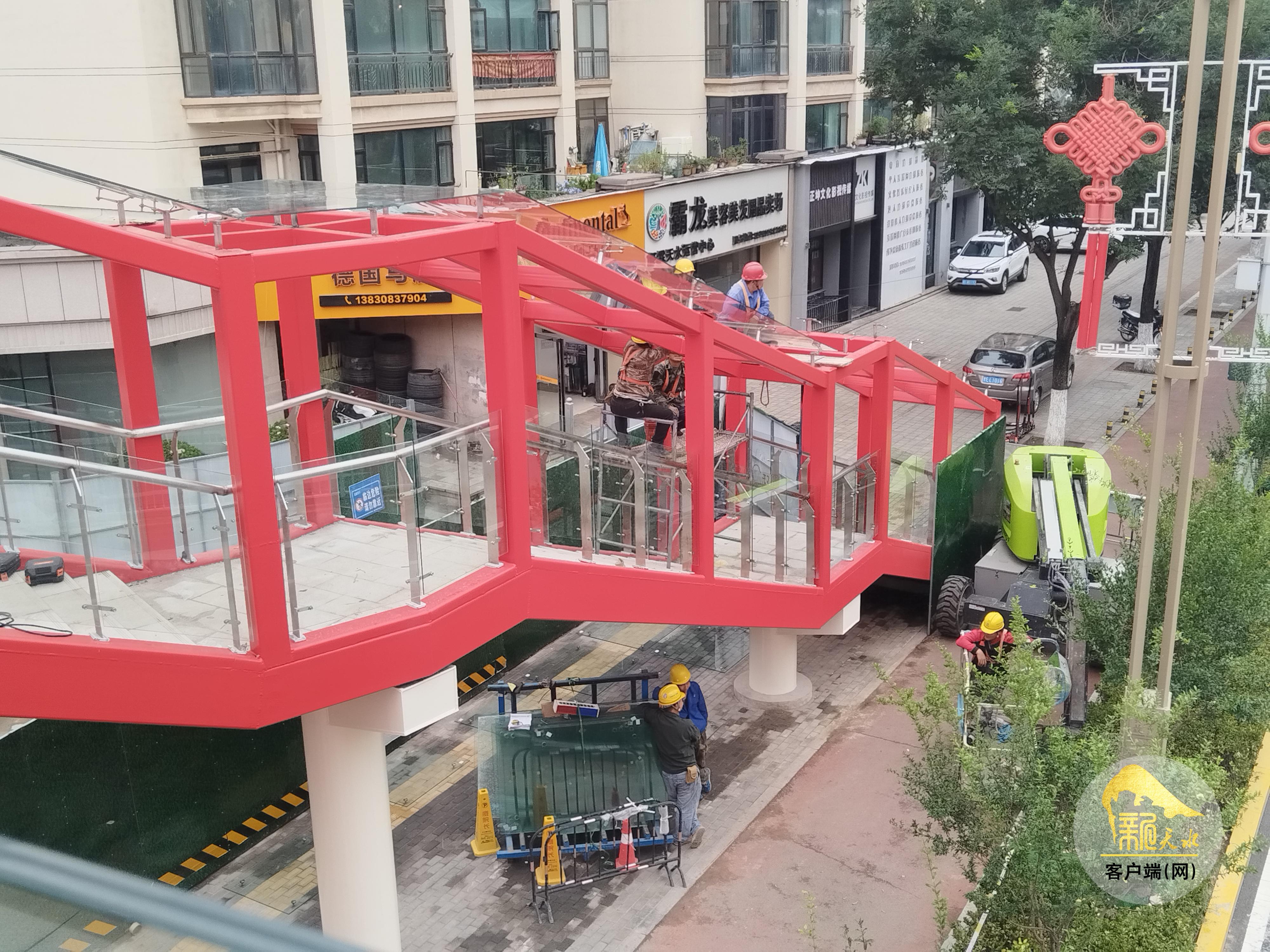 9月10日,记者来到位于秦州区羲皇大道与天庆路的交叉口处,只见一座崭新的红色人行天桥以“口”字形布置,将羲皇大道南北两面以及天庆路东西两面连通起来,施工人员正进行安装部分梯道的雨棚及收尾工作。因为天桥的东面已经具备了通行条件,为方便开学后附近学校、幼儿园师生的通行,天桥东面已经局部提前投入使用,不时有行人通过。放眼望去,整个人行天桥与天庆路以北的红桥遥相呼应。