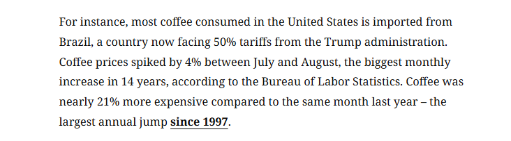 对于涨价,美国消费市场的现实数据中已有所体现:受对巴西征收50%关税影响,咖啡价格在7月至8月间飙升4%,创14年来最大月度涨幅;对墨西哥西红柿征收17%关税后,8月美国西红柿价格涨幅达4%。