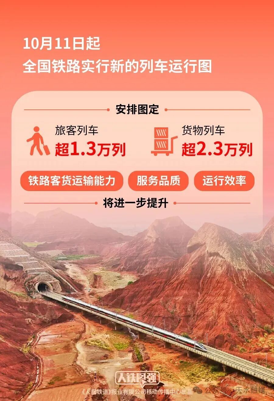 10月11日起,全国铁路实行新的列车运行图,保持客货列车开行规模,优化列车开行结构,安排图定旅客列车超1.3万列,货物列车超2.3万列,铁路客货运输能力、服务品质和运行效率将进一步提升。