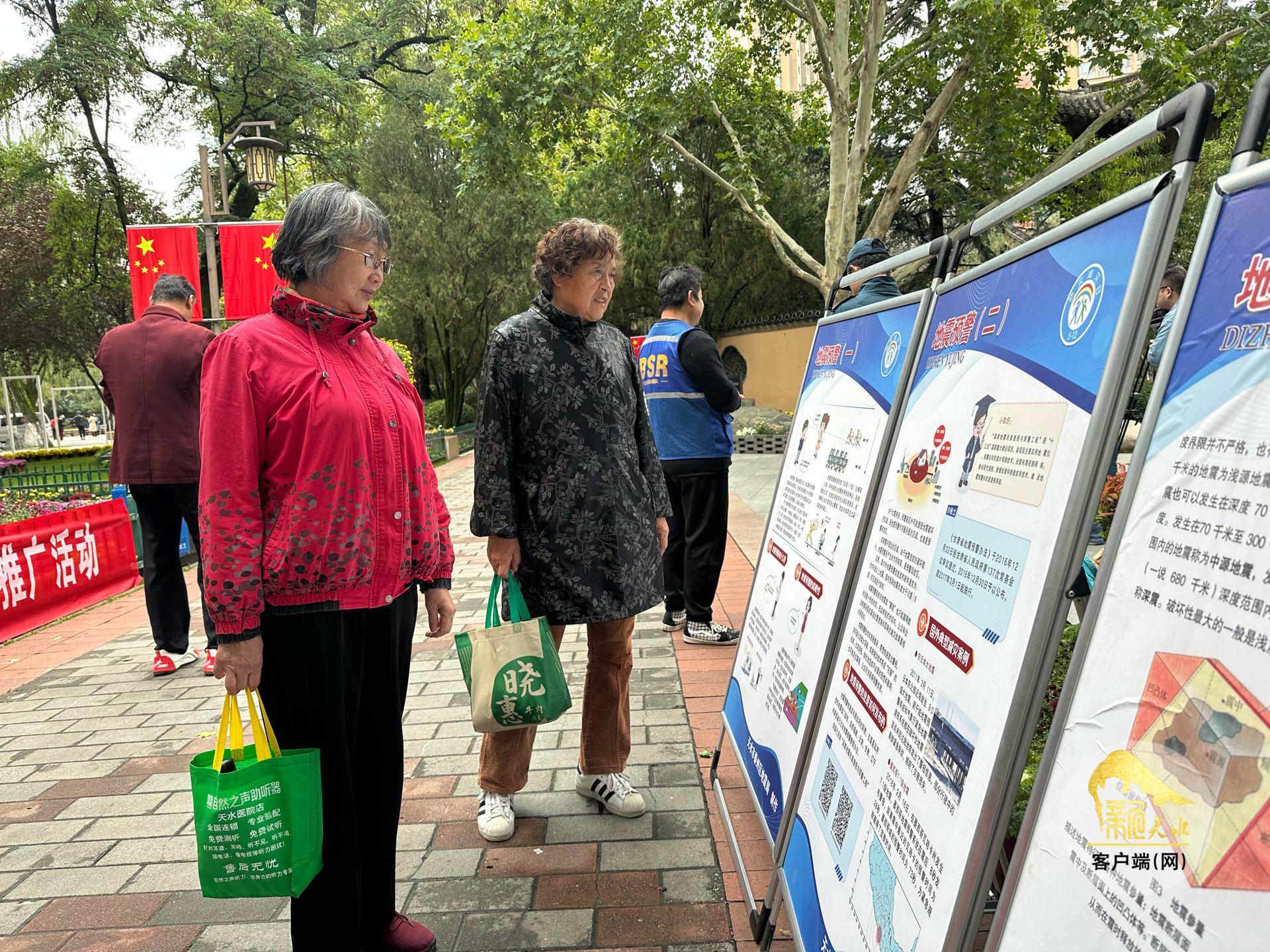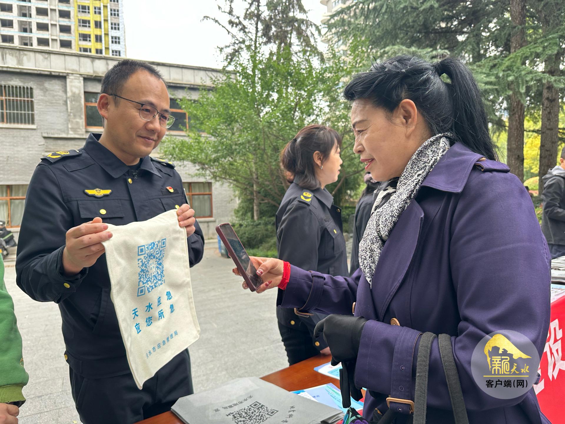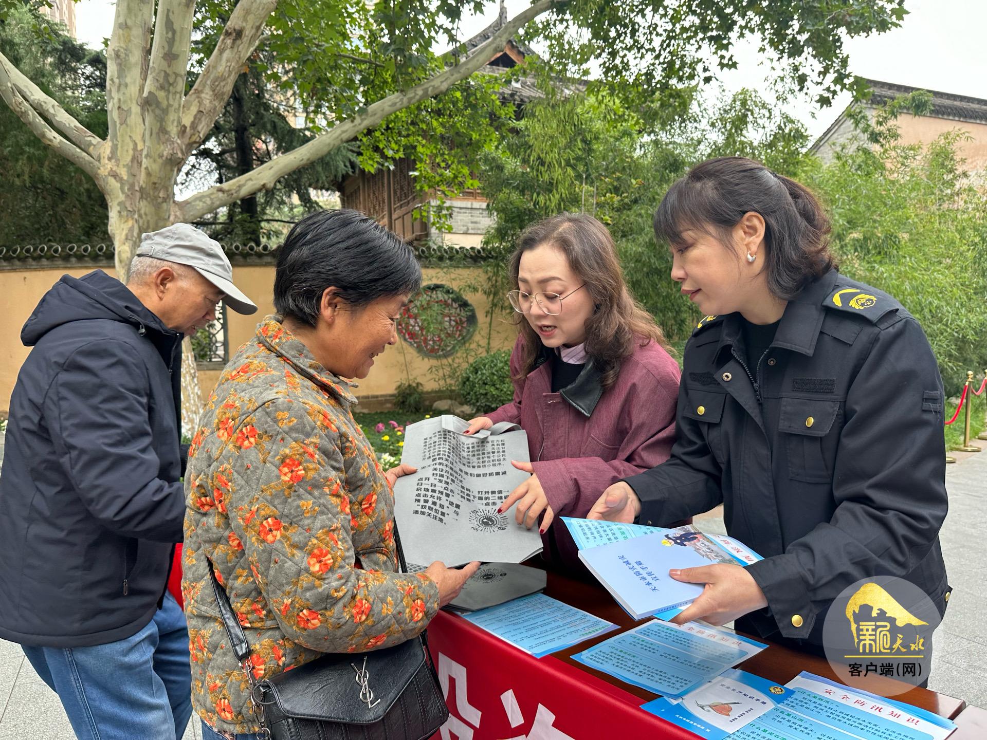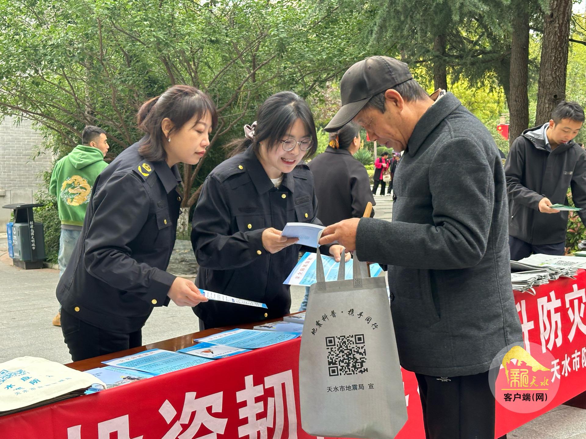 天水市应急管理局、天水市地震局和秦州区地震局的工作人员向过往群众发放了《家庭应急手册》《自然灾害应对指南》等宣传资料,并设立多个咨询台,耐心解答市民关于地震、洪涝、火灾等常见灾害预防与应对的疑问。