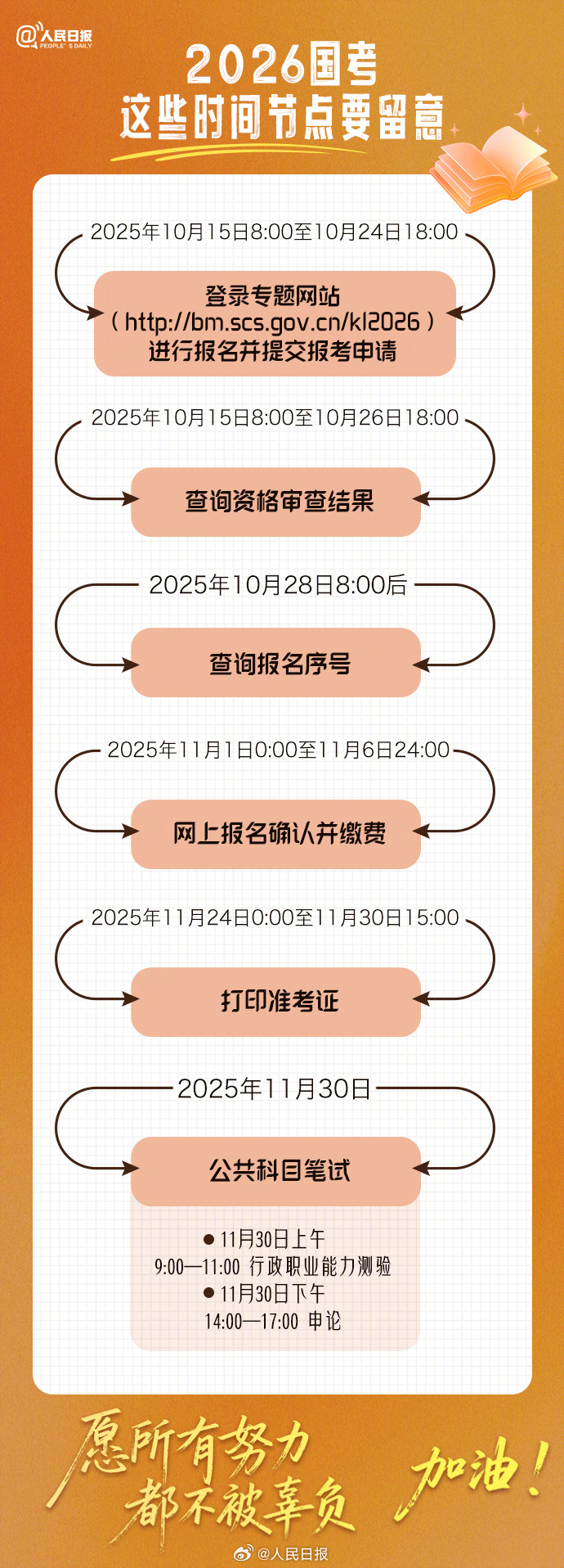 考生可于10月15日8:00至10月24日18:00期间登录“中央机关及其直属机构2026年度考试录用公务员专题网站”(http://bm.scs.gov.cn/kl2026)进行网上报名,公共科目笔试将于11月30日在全国各直辖市、省会城市、自治区首府和部分城市同时举行。