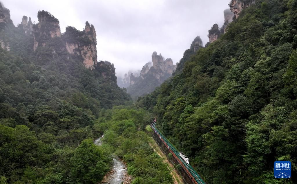10月19日,游人乘观光电车在湖南张家界国家森林公园十里画廊游览(无人机照片)。
