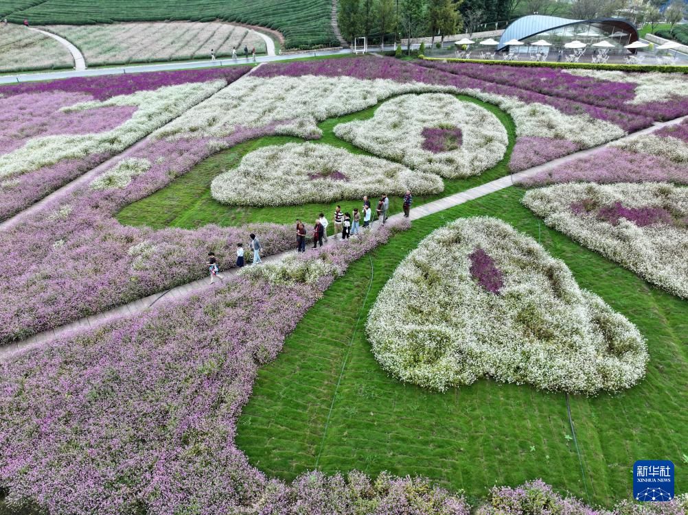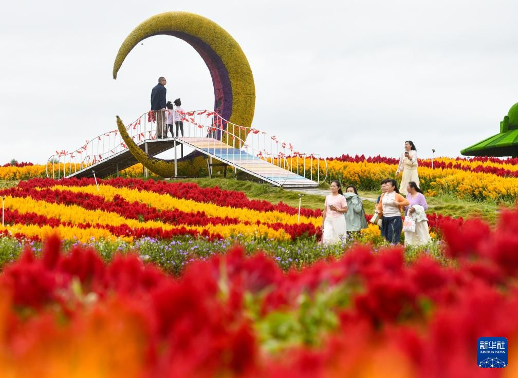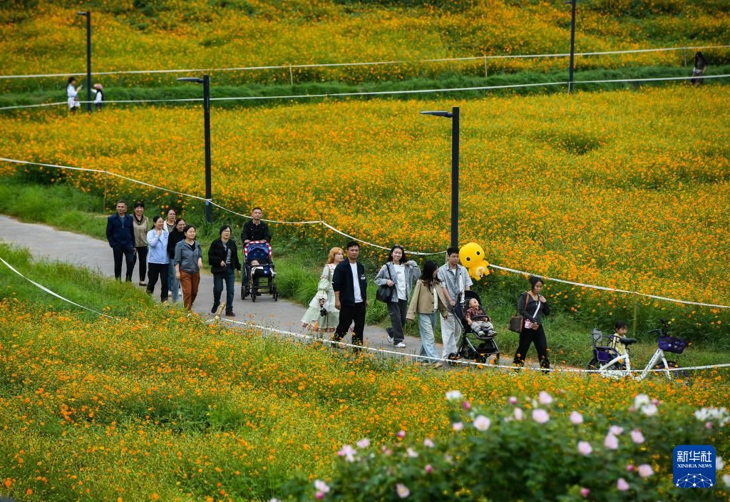 10月19日,游客在广西富川瑶族自治县神仙湖慢城花海景区游玩。
