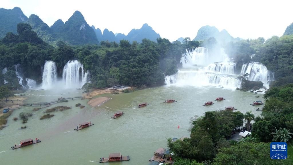 10月18日,在广西崇左市大新县中越德天(板约)瀑布跨境旅游合作区,游人乘坐竹筏游览(无人机照片)。