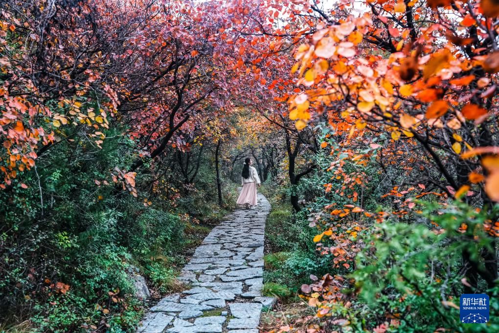 10月19日,游客在河北省遵化市南山常乐谷景区赏景游玩(无人机照片)。