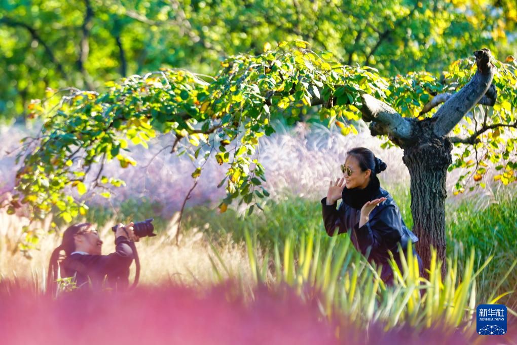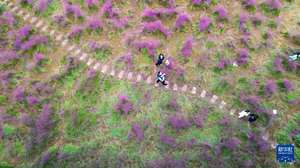 10月19日,在山东省临沂市沂南县卧龙山公园,游客在粉黛乱子草中打卡拍照(无人机照片)。