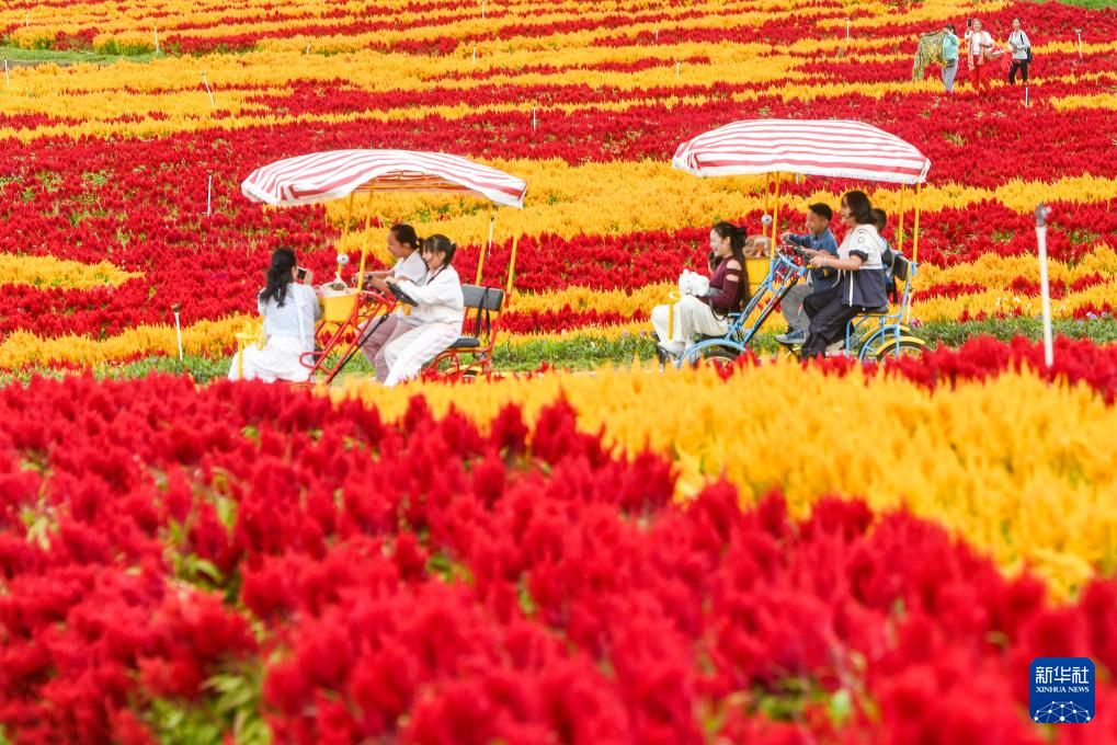 10月18日,游人在广西大新县峒那屿湾景区千日红花田赏花游玩。