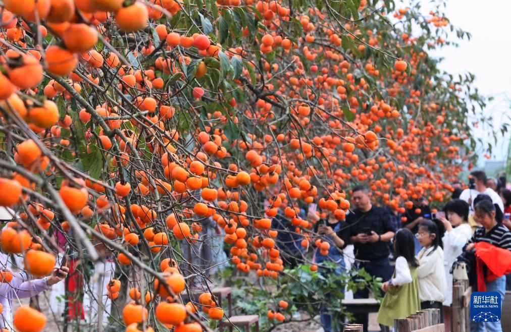 10月19日,市民和游客在四川省乐山市五通桥区汤家坝村观赏柿子树。