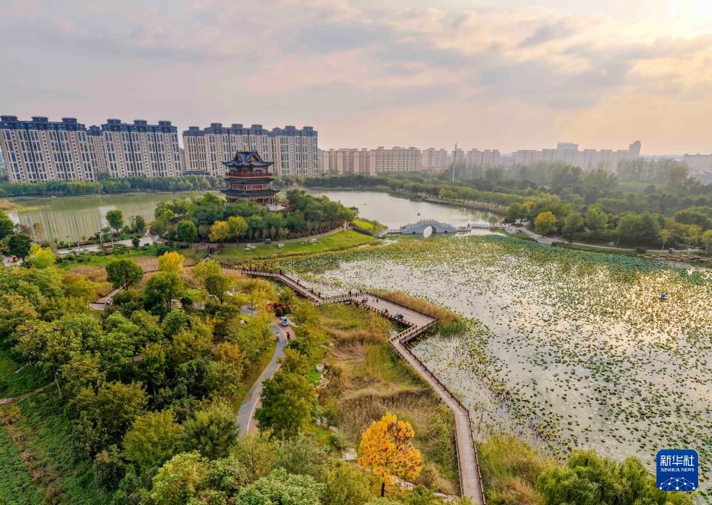 10月19日,人们在河南省焦作市博爱县幸福湖公园赏景(无人机照片)。
