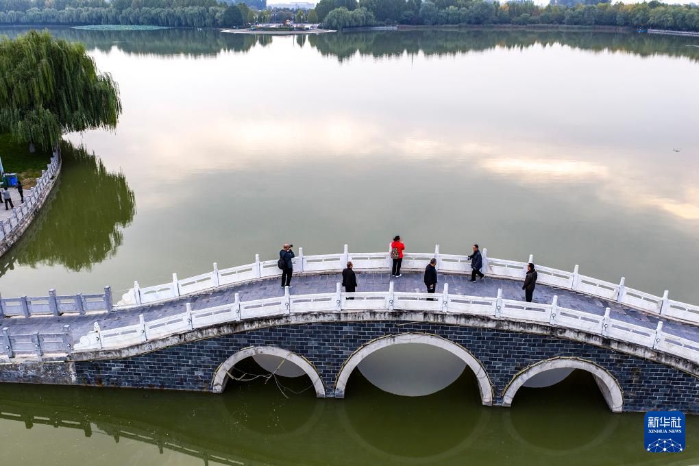 10月18日,人们在河南省洛阳市瀛洲桥湿地公园内游览(无人机照片)。