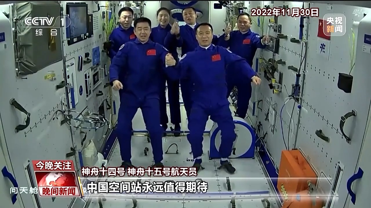 2022年11月30日,翘盼已久的神舟十四号航天员乘组顺利打开“家门”,热情欢迎远道而来的神舟十五号航天员乘组入驻“天宫”。随后,“胜利会师”的两个航天员乘组,一起在中国人自己的“太空家园”里留下了一张足以载入史册的太空合影。