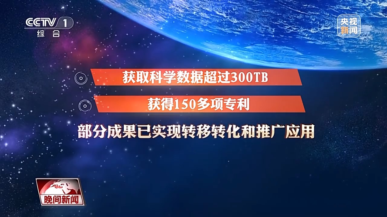 截至2024年12月1日,中国空间站已在轨实施181项科学与应用项目,上行近2吨科学物资,下行实验样品近百种,获取科学数据超过300TB,获得150多项专利,部分成果已实现转移转化和推广应用。