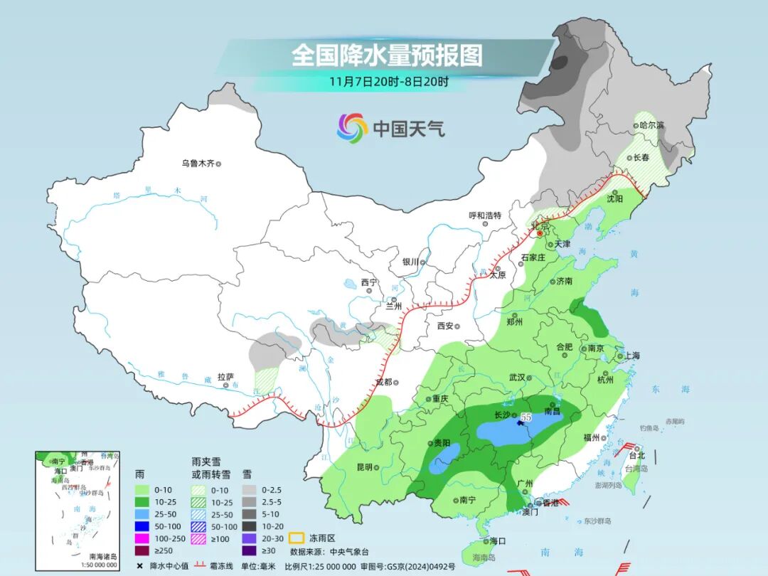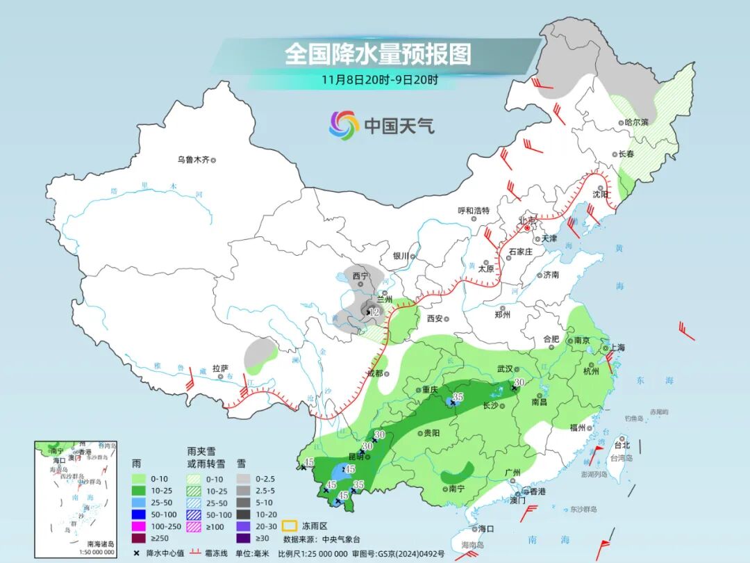 明天夜间到后天,内蒙古东北部、黑龙江东部、吉林东部、青海东部、甘肃南部等地部分地区有小雪或雨夹雪,其中,甘肃南部等地部分地区有中到大雪,局地有暴雪。湖南西部、重庆东南部、云南西南部和中部等地部分地区有大雨。