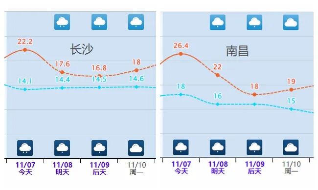 明天,降温将主要出现在贵州、湖南、江西一带,部分地区将出现2℃至6℃的降温。像长沙今天最高气温超22℃,明天降到17℃;南昌今天最高气温超26℃,到9日降至18℃。