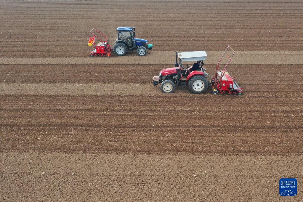 11月11日,河南省焦作市温县黄庄镇常庄村村民驾驶播种机在田间播种小麦(无人机照片)。新华社发(徐宏星 摄)