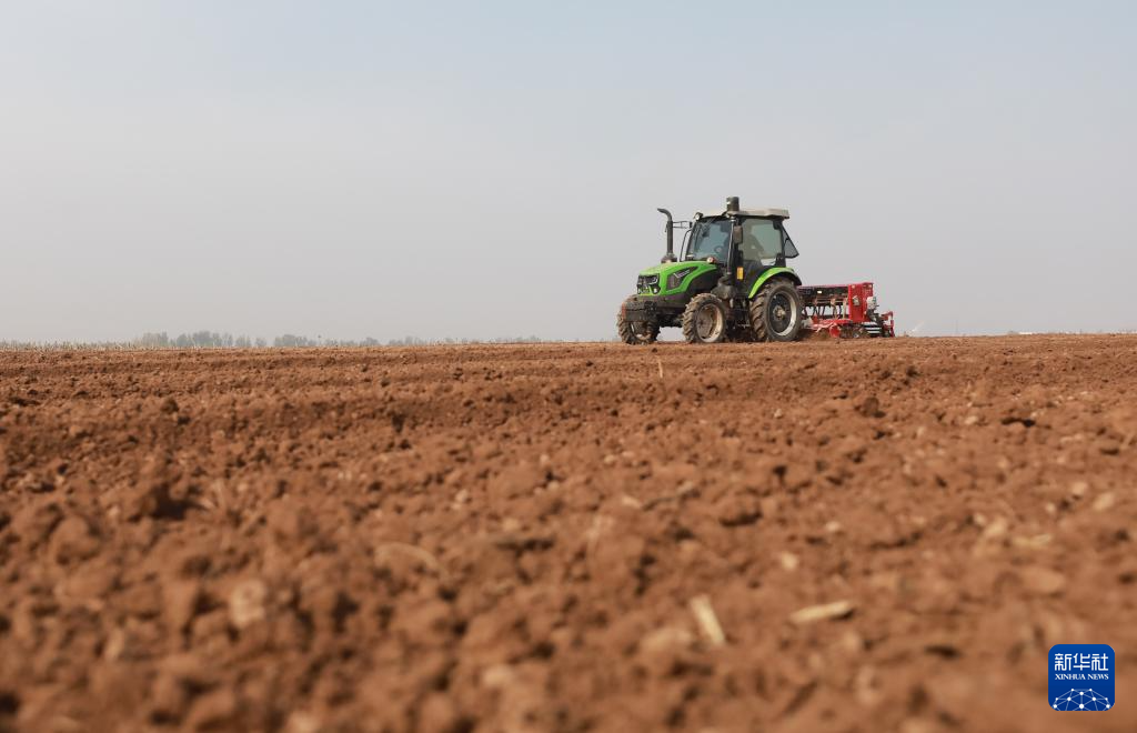 11月11日,农民驾驶农机在河南省焦作市温县黄河滩区播种小麦。新华社发(黄福兴摄)